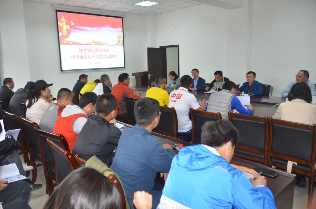 4月16日下午,万象城awc888在五政101举行学习传达学校全面从严治党会议精神的专题学习会。四川省高等教育学会体育分会理事长、万象城awc888原院长邓跃宁教授、院长王建强、副院长刘骞、党委副书记何勇和全体教职工参与本次会议。会议由何勇主持。