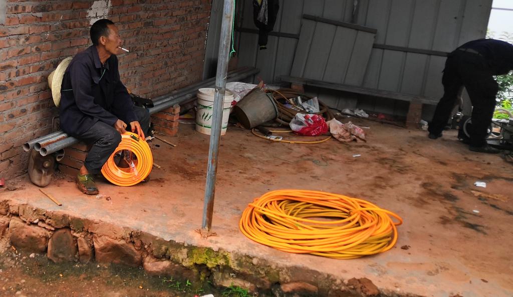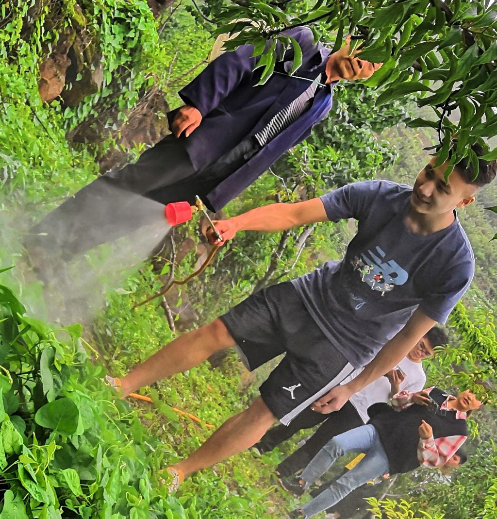 上午,小分队成员踏上了前往寄宿农户果园的山路,路上满是泥泞,摔跤在小路上变成了惯性事件。到达果园,小分队兵分两组,在果农的带领下,一组小分队成员先后帮果农们搬运、连接好今如要喷洒除草农药的工具,从开始的“拙手拙脚”到后来的逐渐熟练,亲身实际操作的成员并未因此影响到果农的工作进度反而提升了工作效率。二组成员则在另外一些果农的带领下,对已经收获过的水果进行第二次的清理采摘。农忙过程中,一组队员因喷洒农药的必要以及果树的参差不齐则需要弯腰,从而感到腰酸腿疼。在喷洒过程中,一组队员一边听取果农指导进行轮回式喷洒(即来回喷洒,使得药剂均匀到位,以达到除草效果最大化);一边询问喷洒农药是否会对果树造成伤害以及影响水果质量,果农耐心回答:“农药喷洒标准是根据政府划定标准进行配制,有相关专家进行实验,所以对于果树是其保护作用。二组队员在采摘残余水果中经常被蚊虫叮咬,树枝划伤。采摘中成员得知,二次采摘也是果园必不可少的一次复习,一方面捡漏水果,另一方面也是检查果树健康状况。上午便在果园中度过,小分队一上午的劳累在果农眼中似乎不值一提,并不是因为工作量的原因,而是果农们早已习以为常,其间心酸不言而喻。