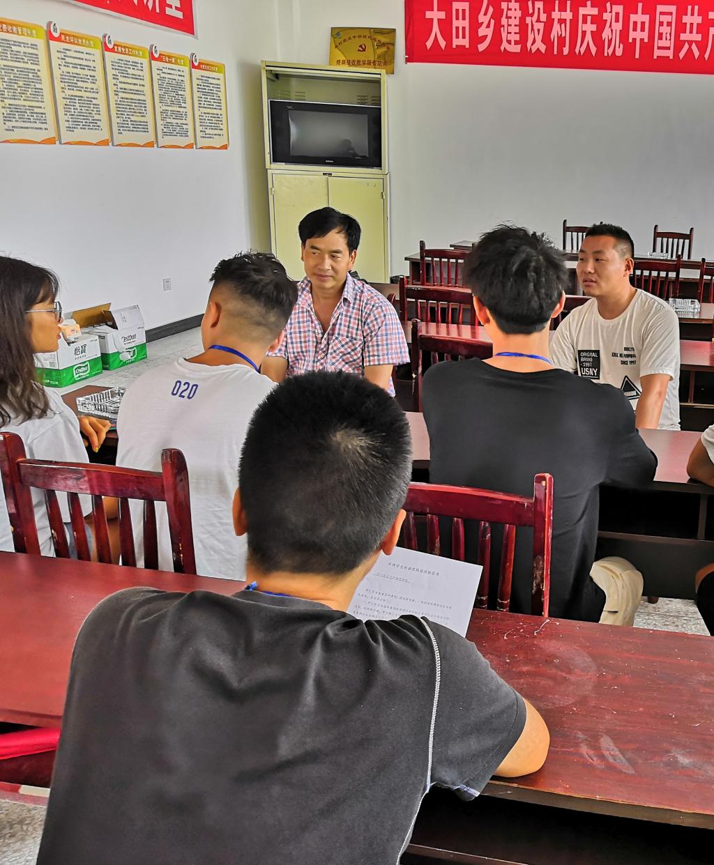 当日时间上午九点整,小分队成员整装待发,徒步来到大田村村委会。进行了以“了解当地经济状况,致力乡村发展”为主题访问。在村长的悉心安排下,小分队成员于村委会会议室展开正式访问。富有经验而又睿智的村长、书记为大家悉心指导并解答各类相关问题。小分队成员向村长询问:当地经济发展状况如何,果农是否有一定收入保障,当发生自然灾害是是如何解决的。