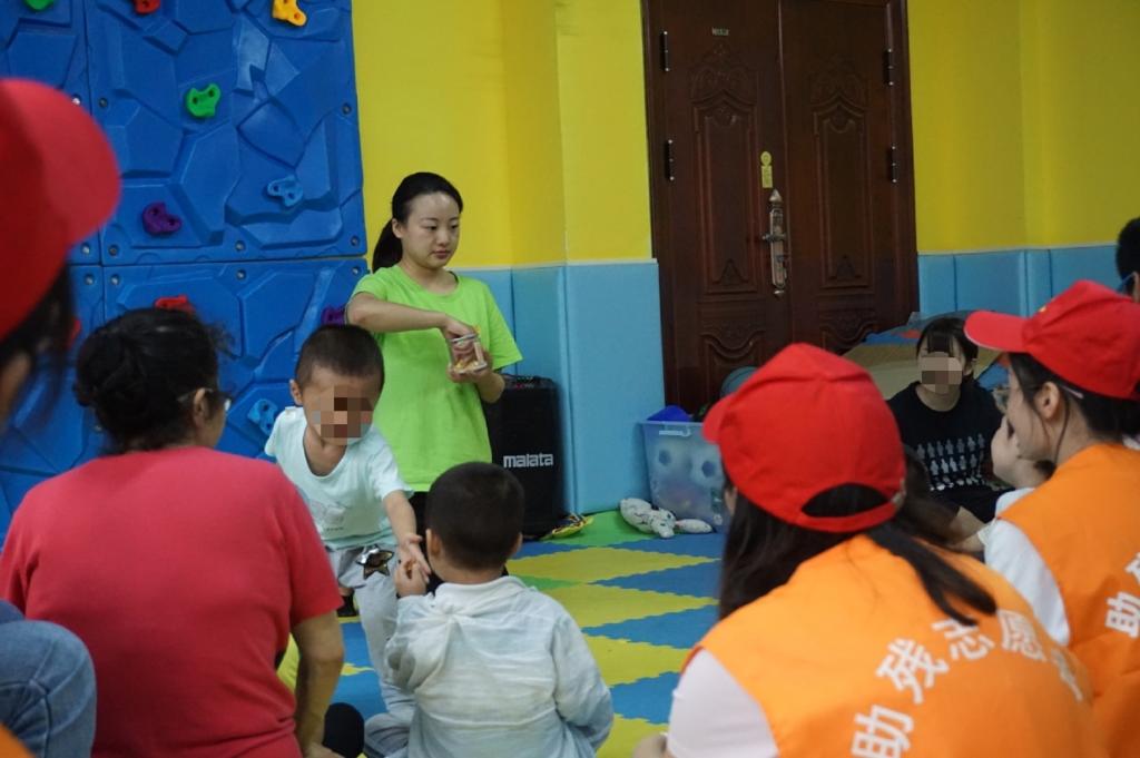 自闭症的孩子都有着自己的小宇宙,他们总是专注在自己的世界里,对建立关系和结交朋友毫不关心,很少和朋友分享快乐,兴趣和成就。今天在老师的带领和志愿者的帮助下,每一个小朋友都要根据老师发出的指令,将手中的礼物送给其他小朋友们,与此同时,在志愿者的带领下接受礼物的小朋友也需要用拥抱给予回应。这样,孩子们封闭的世界才能渐渐的被打开,接受他人,在生命里留下除自己以外的痕迹,接受他们组成的社会关系,成为一个完整的社会人。图02。老师和志愿者带小朋友们学会分享。中国青年网通讯员 赵钰洁 供图