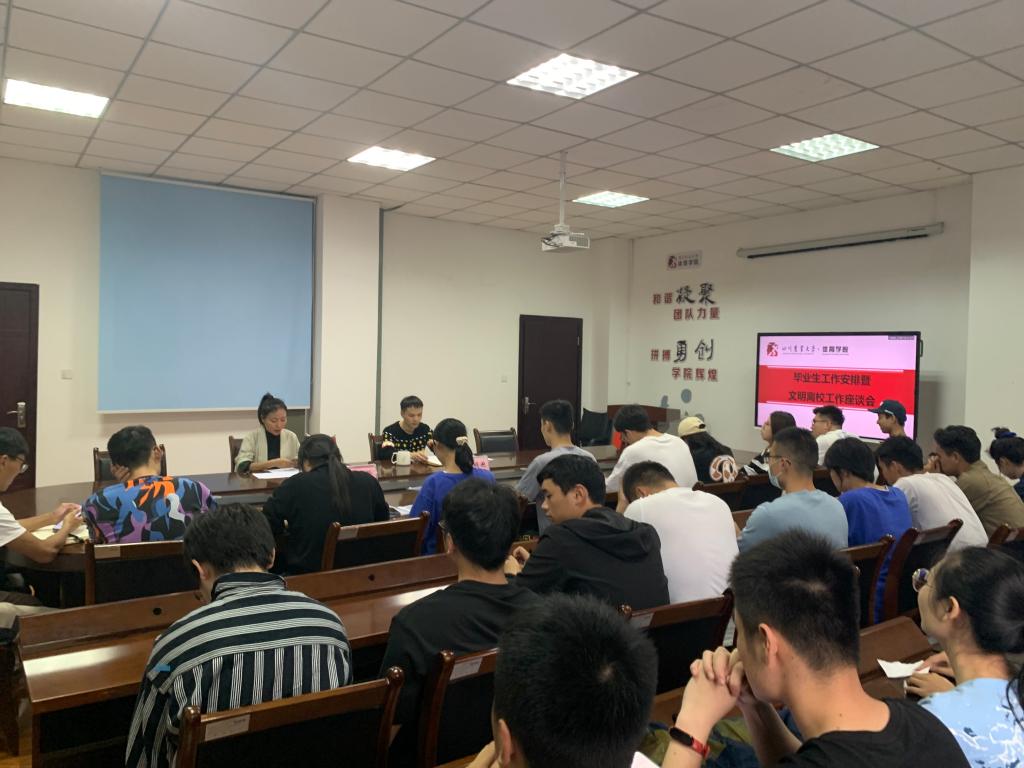 5月25日下午,学院在五政202会议室召开毕业生安全文明离校工作座谈会。学院党委副书记陈明滟、就业秘书郑伊伶以及2018级各小班班长、团支书、寝室室长或寝室代表出席本次座谈会。