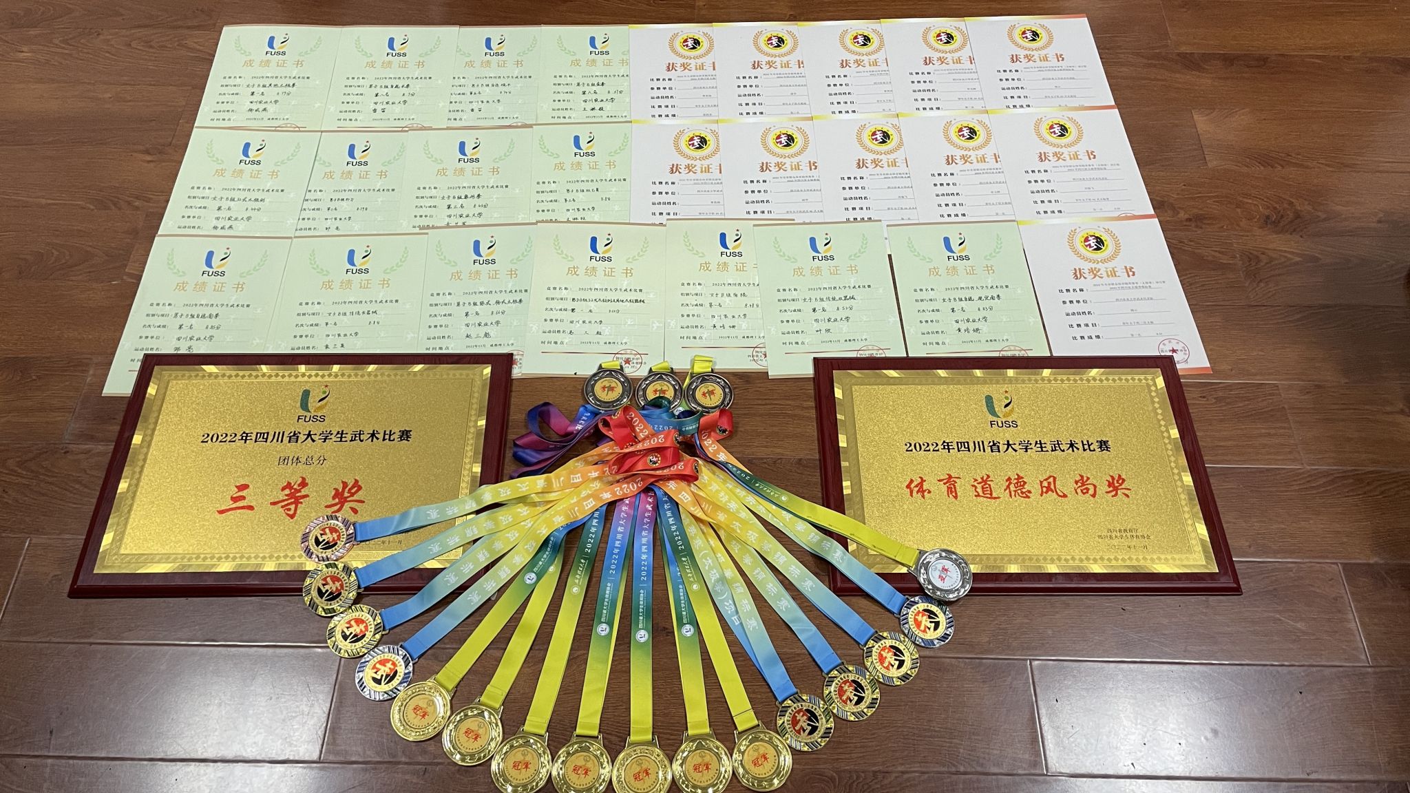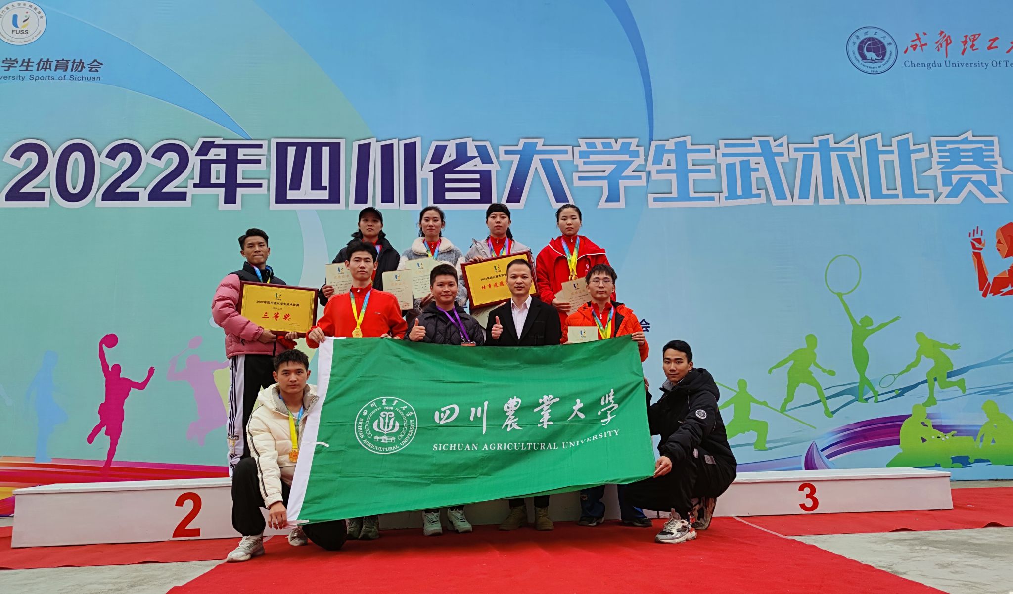 11月18-20号,2022年四川省大学生武术比赛和四川省太极锦标赛分别在成都理工大学和温江体育馆举办。川农“武林高手”一行17人,在太极拳、太极剑、南拳、南棍、传统双器械等项目一展拳脚一举拿下15枚金牌,4枚银牌,4枚铜牌,团体总分获三等奖,集体获体育道德风尚奖。