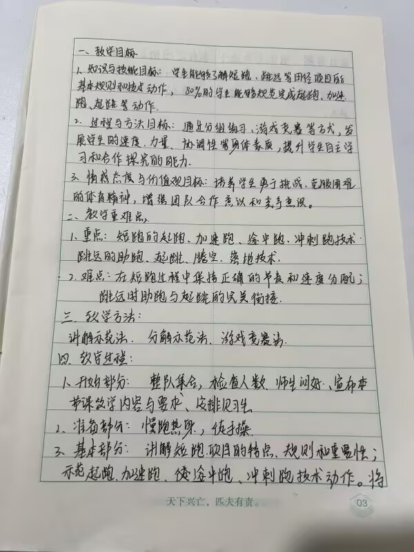 教案组的同学则以文字为载体,设计编写了一节节详尽的体育课教案。他们的教案涵盖了课程基本信息、教学目标、教学重点和难点、教学准备、教学过程以及应急安全措施等六大方面,内容丰富,逻辑清晰。在教案中,同学们同样巧妙地融入了红色元素,通过讲述红色故事、引用红色精神内涵等方式,让体育课不仅是一堂锻炼身体的课程,更是一堂传承红色基因的思想教育课。每一份教案都凝聚了同学们的心血和智慧,展现了他们对体育教学的深刻理解和对红色文化的热爱。