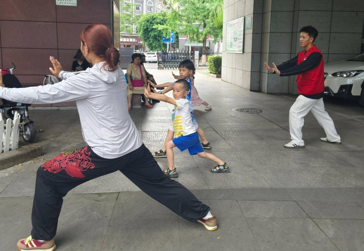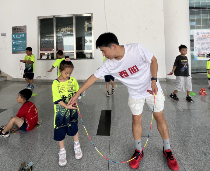 在荣县旭阳镇河街、雅安西大街社区,团队成员化身“体育导师”,为当地少年儿童带来了体育公益课堂。跳绳课堂上,彩色标志桶划分出不同难度的练习区域,从单人连续跳、双人花样跳到 “跳大绳接力”,队员们示范着连贯的摆臂动作,孩子们跟着节奏蹦跳,绳影翻飞间逐渐找到韵律感。武术课上,队员们将 “马步”“冲拳” 等招式拆解成易记的口诀,“马步像扎根,冲拳如射箭”,孩子们稚嫩的招式里透着认真,一招一式间不仅锻炼了协调性,更培养了坚持不懈的品格。