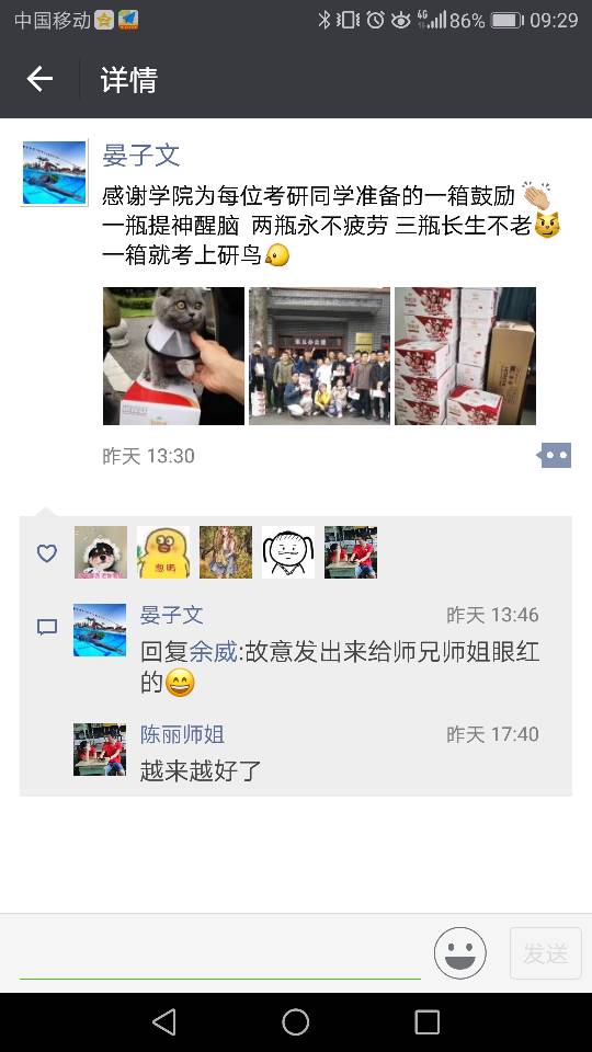 这个深秋暖意浓浓,10月24日上午,万象城awc888举办了2019届考研学生打气送温暖活动。2019届毕业生有117人,约55%的毕业生选择考研深造。学院为表达对学生的鼓励和支持,决定为所有考研的学生送温暖,赠与牛奶一箱,为他们补充营养、加油打气,愿他们在最后的冲刺阶段再接再砺,考出好成绩。晏子文在朋友圈说到:“感谢学院为每位考研同学准备的一箱鼓励,一瓶提神醒脑,两瓶永不疲劳,三瓶长生不老,一箱就考上研了”。部分2019届学生告诉老师,现在已经完成第一轮的复习,全力冲刺第二轮,准备第三轮复习,一定不辜负学院的栽培和支持,拿下这场特殊的“战役”。满满一箱牛奶,表达了学院对学生浓厚的情感和殷切的希望,紧密了学院和学生的关系。