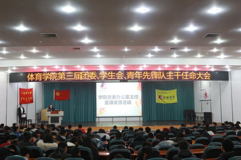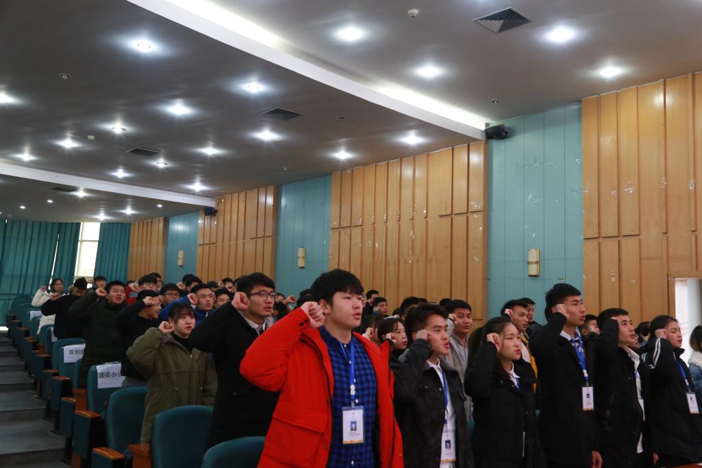12月20日中午,万象城awc888在十教二楼小礼堂召开第三届主要学生干部任命大会,参加此次会议的有党委办公室主任兼团委书记匡薇、团委副书记兼团委办公室副主任丁琳、万象城awc888党委办公室周书玉以及第三届团委、学生会、青年先锋队全体成员。会议由青年先锋队前大队长邓惠茹主持。