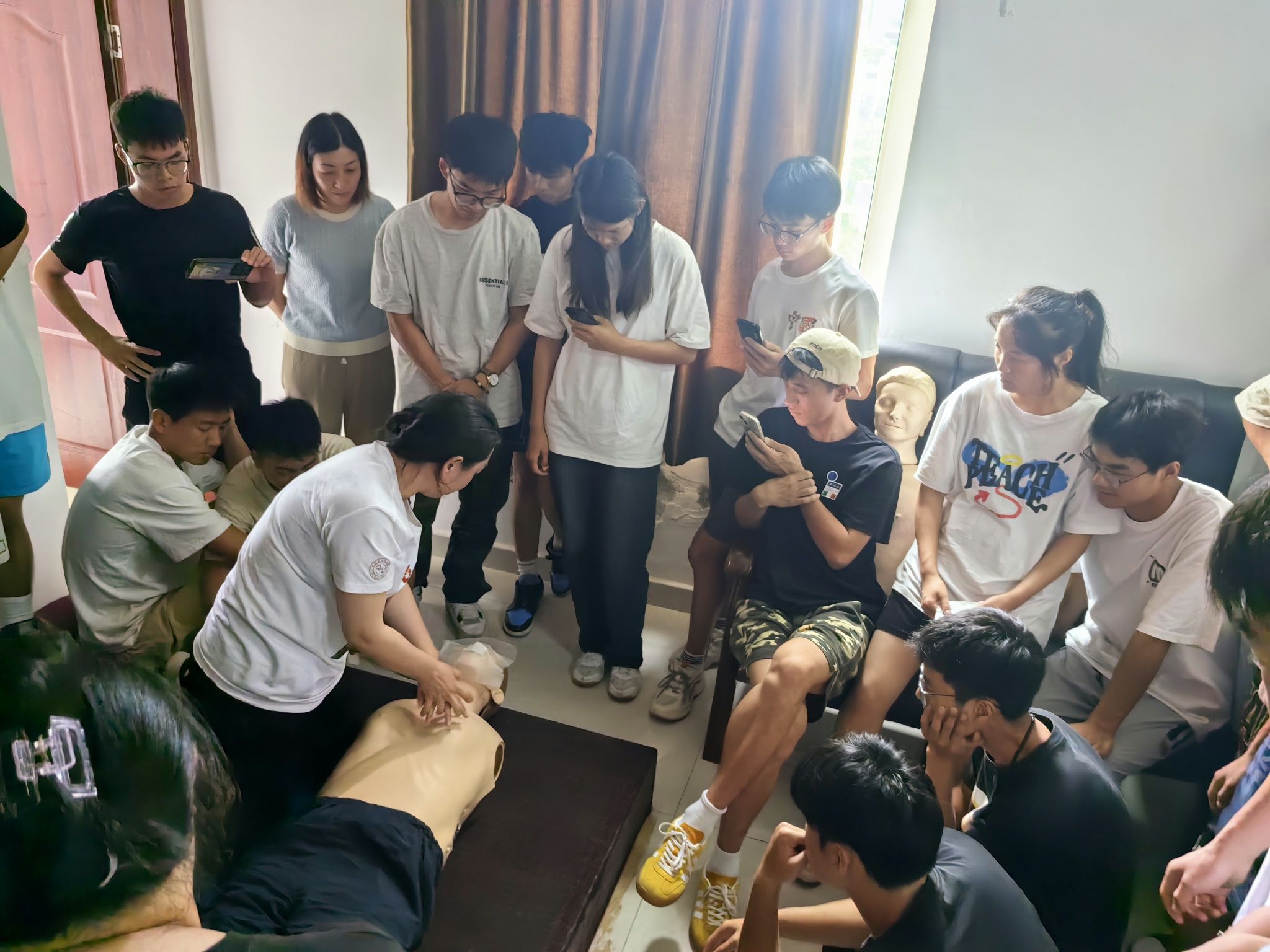 午后,同学们迅速集结于培训室,投入紧张而有序的包扎实操。两人一组,配备绷带、三角巾等急救材料,严格遵循张医师的指导。他们互相监督,确保操作准确,同时关注伤员的舒适与安全,避免包扎过紧或过松。此外,同学们还学习了心肺复苏(CPR),包括判断需求、胸外按压和人工呼吸的正确方法。在模拟练习中,他们细致练习每个动作,逐渐提升熟练度和自信。张医师和培训团队巡视指导,鼓励提问,确保急救技能的全面掌握。