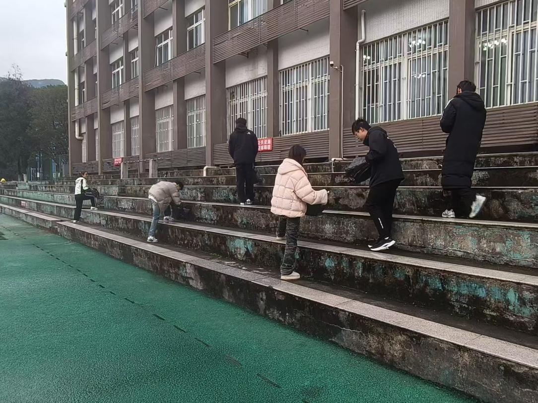 从攀岩墙到运动场,从游泳池到体育馆,每一处都能看到学生们忙碌的身影。同学们分工明确,有的同学细致地打扫着攀岩墙,不放过任何一个角落;有的认真清扫着运动场和楼道上的垃圾和枯枝落叶,保持环境的整洁;有的拿着拖把清理着地面的污垢,让地面变得更加干净明亮。扫帚与地面的摩擦声仿佛是一曲劳动的赞歌,赞美着每一位劳动中的同学。