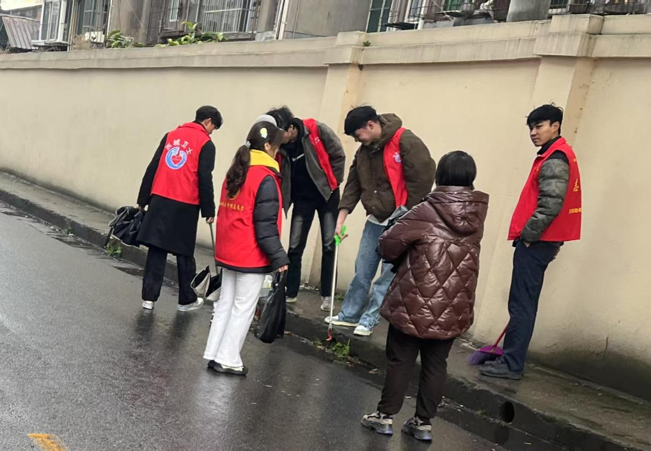 活动开始,志愿者们迅速冒雨集结,随即分成清洁、交通指挥两组,奔赴各自岗位。清洁小组手持扫帚、铲子和垃圾袋,仿若专业环保人员,在社区内忙碌穿梭。他们迅速清理街边堆积的杂物和散落的垃圾,仔细搜寻角落的烟头,在花坛区域,俯身用夹子夹取烟头、纸屑等各类垃圾,并拔除杂草。尽管雨水打湿衣衫,他们依旧专注投入。随着清扫工作推进,阳光穿透云层,为打造整洁社区增添助力。