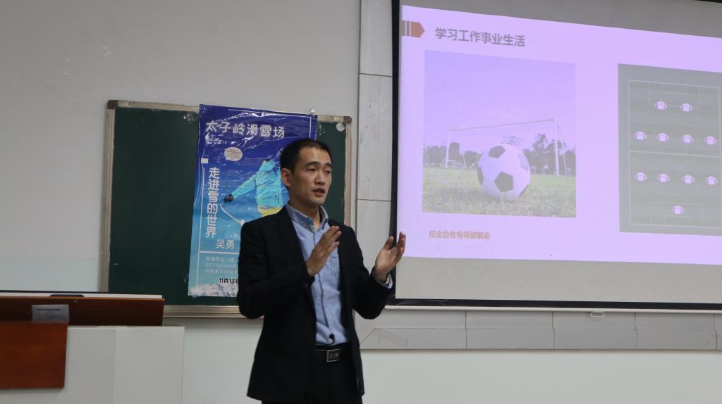 吴勇讲解了关于他从大学开始的创业故事,接着着重介绍了如何进行择业。他用通俗易懂的田径、足球来描述个人的优缺点,提出要进行正确的定位和职业发展方向,并用武术抱拳礼来解释对人生的态度、职场礼貌,同学们受益匪浅。工作人员会议开始前就积极收集同学们的问题,以便有针对性的进行介绍和分享。九鼎山太子岭滑雪场人事结理牟江嵘通过播放宣传片、PPT展示、面对面交流等方式进行了公司介绍、公司现状并介绍了公司招聘的岗位以及需求问题。同学们踊跃的发言让宣讲人都显得有些接应不过来了,相信在听了本次宣讲会后同学们对日后就业方面更加拥有信心了,同学们在关心薪资前景的同时更为详细的咨询了合同签订的相关事宜,少了些盲目,多了些理性。