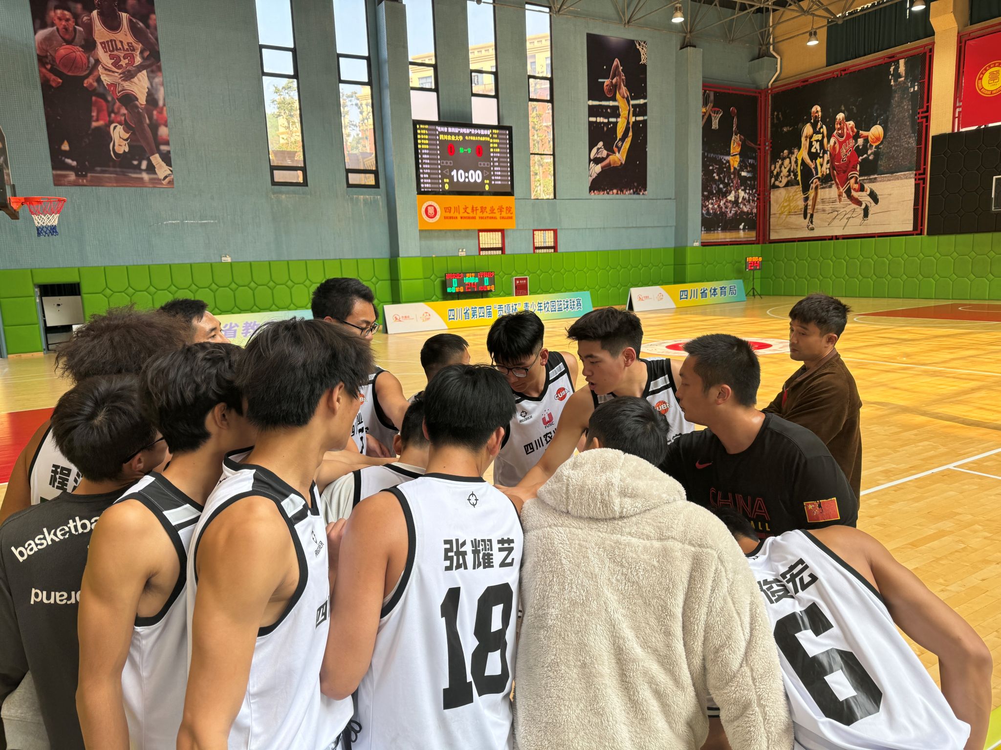 11月27日,由四川省教育厅、四川省体育局、共青团四川省委主办,四川省大学生体育协会执行,四川文轩职业学院承办的四川省第四届“贡嘎杯”青少年校园体育联赛在四川文轩职业学院举行。万象城分配到C组,分别对阵:电子科技大学成都学院、阿坝师范学院、西南科技大学、四川大学锦江学院、成都师范学院、四川大学,以三场胜利取得小组第三的成绩。此次比赛得到各级领导的大力支持,由万象城awc888胡鸣飞老师担任带队教练。万象城全队队员抵达四川文轩学院进行报道,报道后拿到参赛证队员们迅速投入状态,在体育馆进行投篮训练熟悉场地。晚上7点,胡鸣飞教练和谢地队长、达俊宏队长参加了组委会、领队、教练员联席会,了解了比赛禁忌和相关规定后传达给了每一位队员,胡教练也对首发阵容进行分析和布阵,以最好的状态迎接第二天比赛。