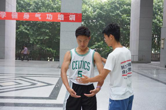 本次教学分为三步走:第一步练形体,就是把动作熟悉,流畅。第二步是练气,就是呼吸。气功就是用自己的气息,带动血液的流行,从而打通自己的经脉,使血液无障碍地运行。第三步是练心,就是在气功的练习过程中,把自己沉静在自己臆想的一个美好环境下,通过练心的阶段,就可以处乱而不惊,气定神闲,身轻而志纯。通过以上的三个阶段,学生们从熟练动作开始,在教练的指导下慢慢融入自己的感受。经过两周多的训练努力,各学院的八段锦功法演练势正招圆,整套动作柔和缓慢,方圆相应,松紧结合。