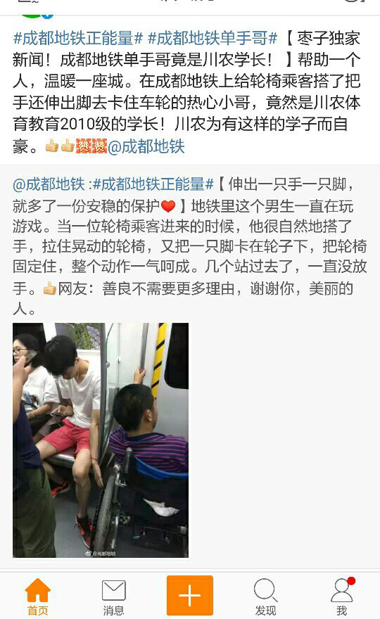 笔者通过吴松当时的班主任联系到他。他说,自己从来都没有想到会因为自己的无意之举就成了“网红”。由于看到轮椅不便,那位朋友用手抓住车厢里的扶手,由于列车制动,轮椅就出现了滑动,他看到轮椅晃动,就用手把轮椅扶住,用脚把轮椅固定住,“当时手和脚虽然都麻了,好像一共扶了10个站左右,但能帮到人就值了。”没想到一个善意的小动作,短短的一天时间里,数十万人为他的善行点赞,一手玩着手机看视频,还听着音乐,一手扶着轮椅这么简单又帅气潇洒的动作,温暖了一座城市,感动了千万网友的心。