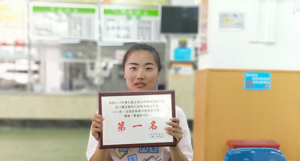 “我还清楚地记得我的那双运动鞋,磨得破破的,永远忘不了它的样子。”体校的生活是每天重复的体能练习,跑楼梯、跳马、俯卧撑,绕着食堂一圈又一圈。这段枯燥而乏味的时光磨炼了她的意志,不仅让她成绩逆袭,成功考上县上最好的高中,更是让她有底力去面对更高的山峰。“我的专业技能并不强,正因为如此,我选择比别人多一分努力。”刚入大学的她发现,作为山东人的自己文化课基础较为扎实,但是专业技能相对薄弱。作为体育专业的学生,专业技能不好怎么能行呢?因此,她跟随室友一起参与健美操代表队训练。那时的她协调性特别差,刚刚学会1个八拍的动作,再继续学习2个,动作立马就会混淆,始终学不会一套完整的操。“作为一个女孩子嘛,应该还是要学会跳操”就是这样一个简单的想法支撑着她。课余时间约室友、约师姐,加班加点的练习,从学动作到规范动作,一遍不行就两遍,两遍不行就三遍,于是,夜里的操场铺满了她跳动的身影。健美操表演需要展现最自信的笑容,起初她确实是不自信的。“记忆最深的是我的助班梁琼师姐拉我在二区主干道跳,那里路过的人真多呀,师姐鼓励我就是要在众人面前跳,脸皮不能太薄。”一次次的表演渐渐变成一种享受,并乐在其中。全国全民健身操舞大赛一等奖,四川省大学生健美操啦啦操体育舞蹈比赛一等奖等奖项是她意料之外却也是情理之中的收获。