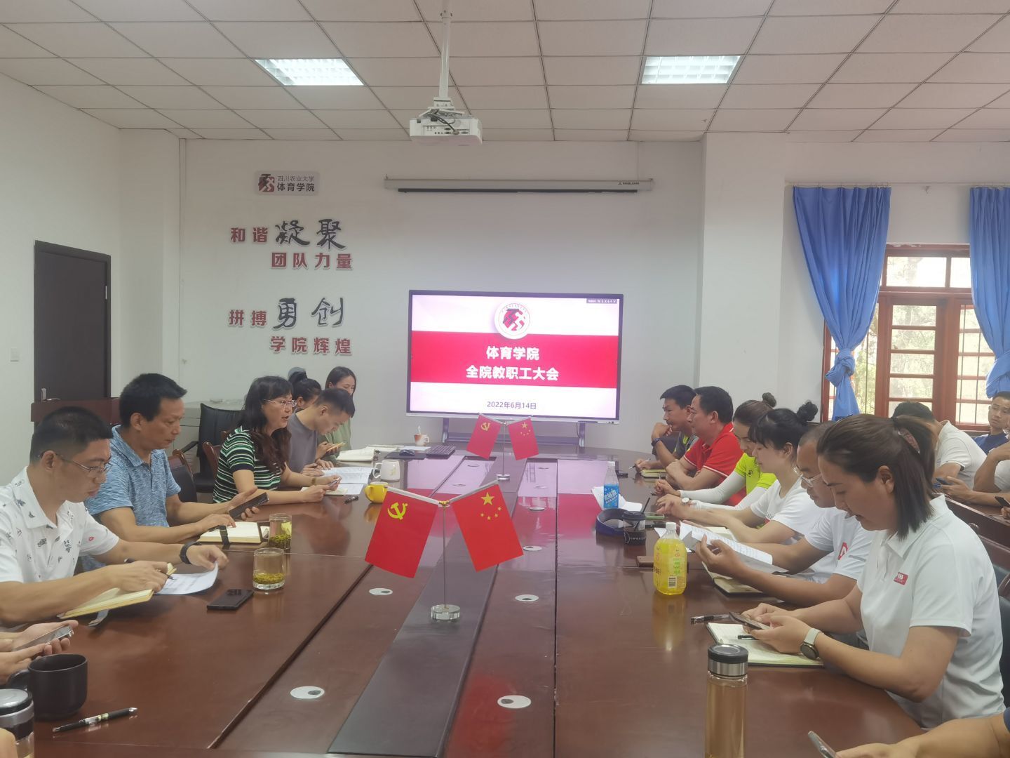 6月14日,万象城awc888全院教职工大会在第五办公楼202会议室召开,学院领导班子及全体在雅教职工参加了本次会议,会议由院党委书记杨英主持。