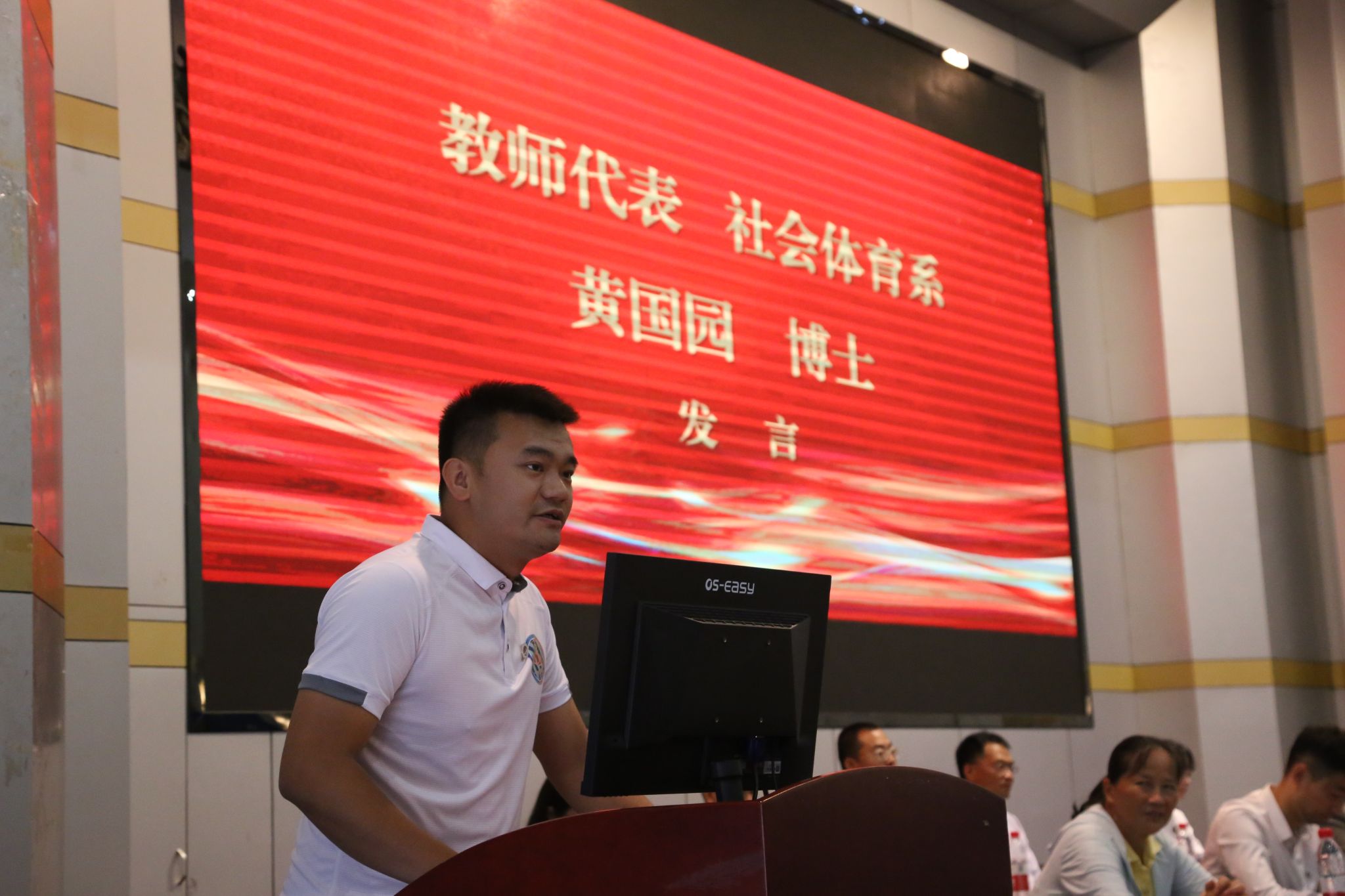 教师代表黄国园博士结合自身实际与同学们分享了自己的三点感受。一是要保持骄傲,尊重自己、认可自己,对成功的渴望像呼吸一样;二是对自己狠一点,忍受常人所不能忍的痛苦,努力朝着成功的方向前进;三是做一名有底线思维,遵纪守法、恪守公序良俗的基础规则的幸福体育人,选择喜欢的正能量生活方式,去看书,去旅行,去体验精彩人生,做一个开心的、幸福的体育人。