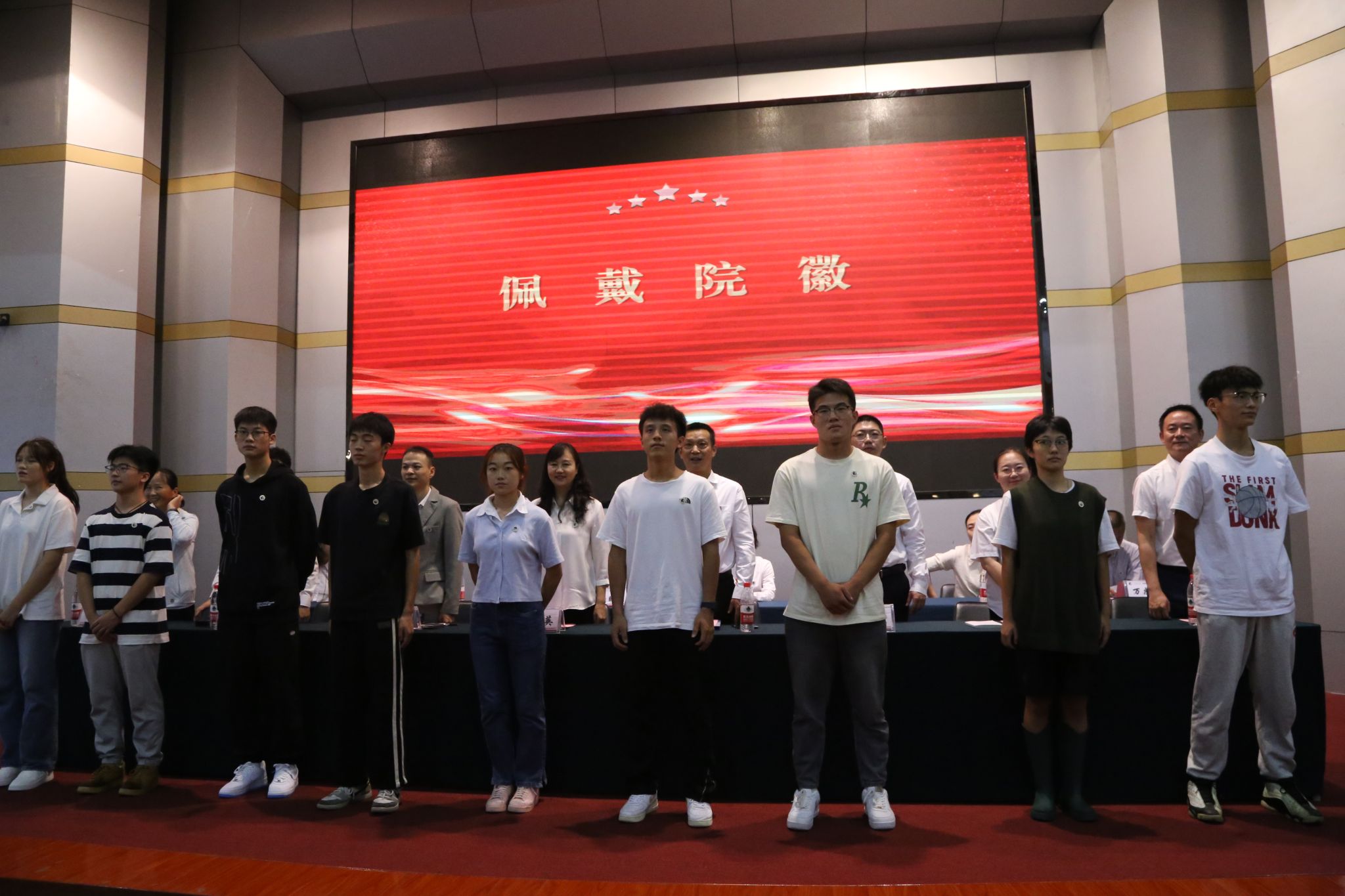 台上就座的领导为新生代表佩戴院徽,全体新生起立自行佩戴院徽。戴上院徽就是川农体育人,角色和身份在这里开始转变,梦想新的征程从这里开始起航。