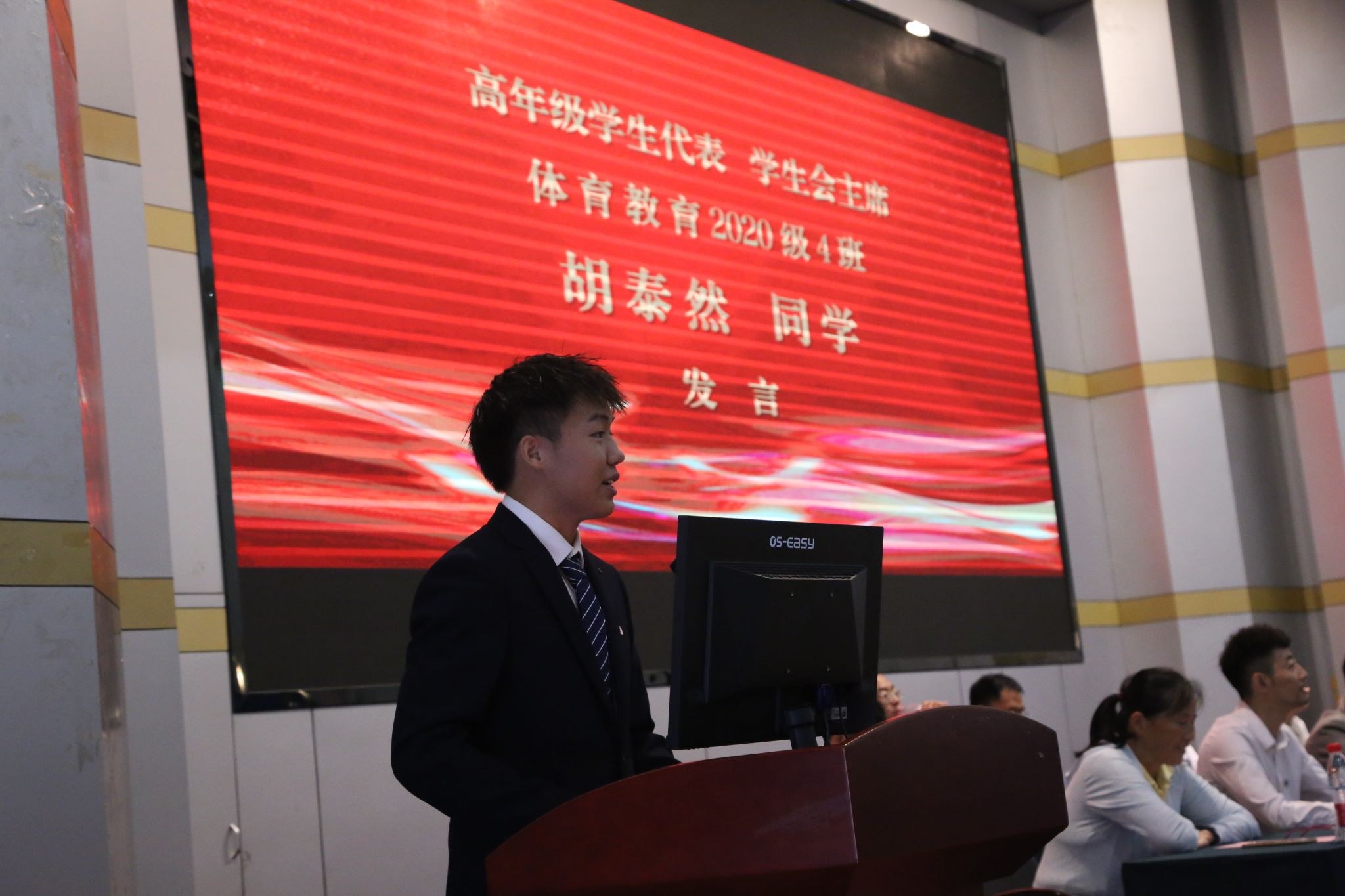 学生代表、第七届万象城awc888学生会主席、2020级体育教育专业胡泰然师兄发言。他代表万象城awc888的学长学姐,结合自己的大学经历分享了几点感受。一是向下扎根,向上生长,严于律己,做有内涵有品味有文化的体育人;二是向外探寻,向内思考,提升自身综合能力、加强与老师、学生之间的交流沟通、参与各类活动;三是向美而立,向光而行,以优秀榜样为目标不断提升自己。