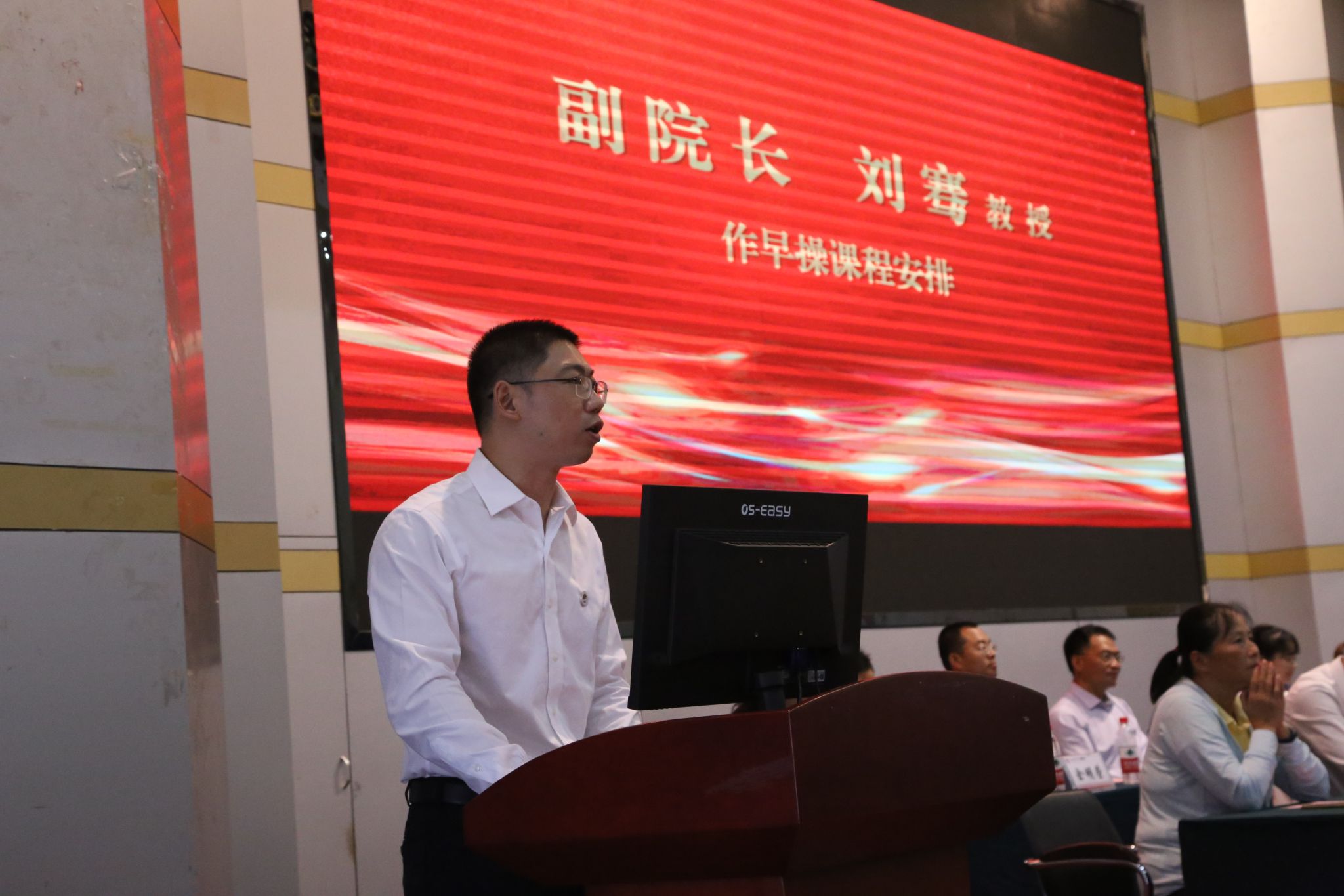 学院副院长刘骞对近期的教学工作进行了安排和解读,他对早操进行了安排和说明,期望同学们在大学也继续勤学苦练,艰苦奋斗,展现出体院学子精神风貌!