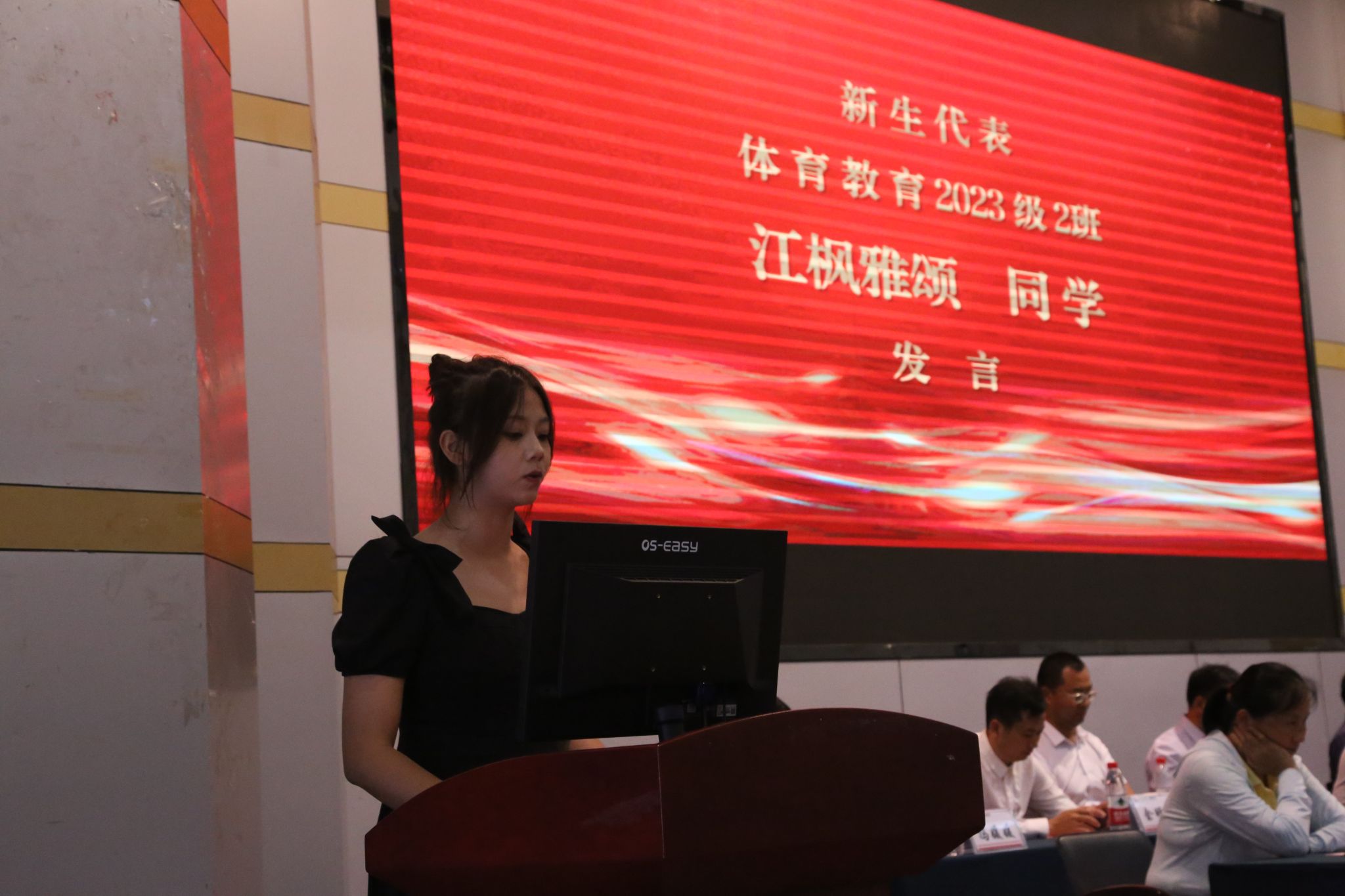 体育教育2023级2班的江枫雅颂同学作为新生代表上台发言。她和同学们分享了自己考上大学的感悟和体会,希望和同学们一起做好基础理论知识的学习,为自己的职业规划奋斗,以勤为径,以苦做舟,努力提高自己的综合素养。
