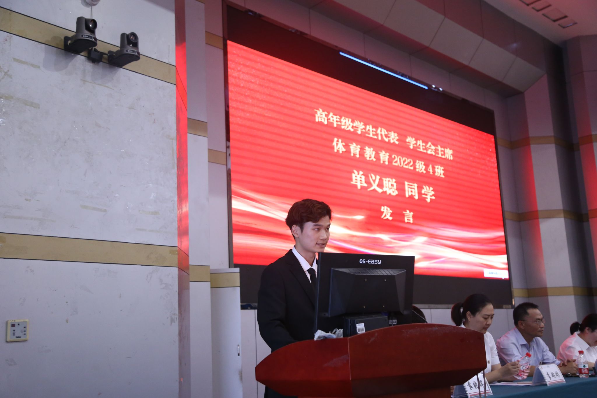 学生代表、第九届万象城awc888学生会执行主席、2022级体育教育专业单义聪师兄发言。他代表万象城awc888的学长学姐,结合自己的大学经历分享了几点感受。一是认识自己,做好规划,严于律己,做有内涵有品味有文化的体育人;二是摆脱懒惰,坚持学习,在大学里,学习才是天职,我们要不断提高对自身的要求,坚持做一位终身学习的体育人;三是参与实践,创造价值,我们要通过不断地参加各种实践,来确认自己到底能做什么,能做到什么程度。