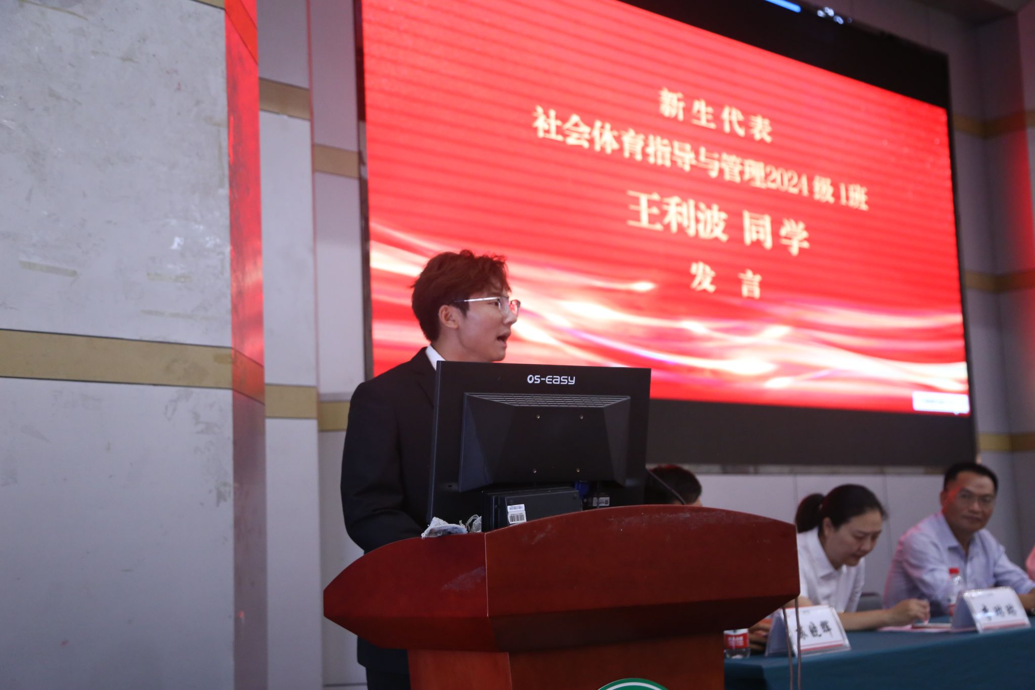 2024级社会体育指导与管理专业1班的王利波同学作为新生代表上台发言。他谈到:“我们每个人都是平凡的人,而只有自己才能让自己变的不平凡。大学和高中相比多出最多的就是时间,如果你不能做时间的主人,那么你就会变成时间的奴隶。要想成为‘破壁少年’,你必须学会卧薪尝胆,更需要三年面壁,最终才能得以绽放。所有的一战成名背后都是百无聊赖的重复,你要相信你的汗水浇灌的必将是胜利之花。”