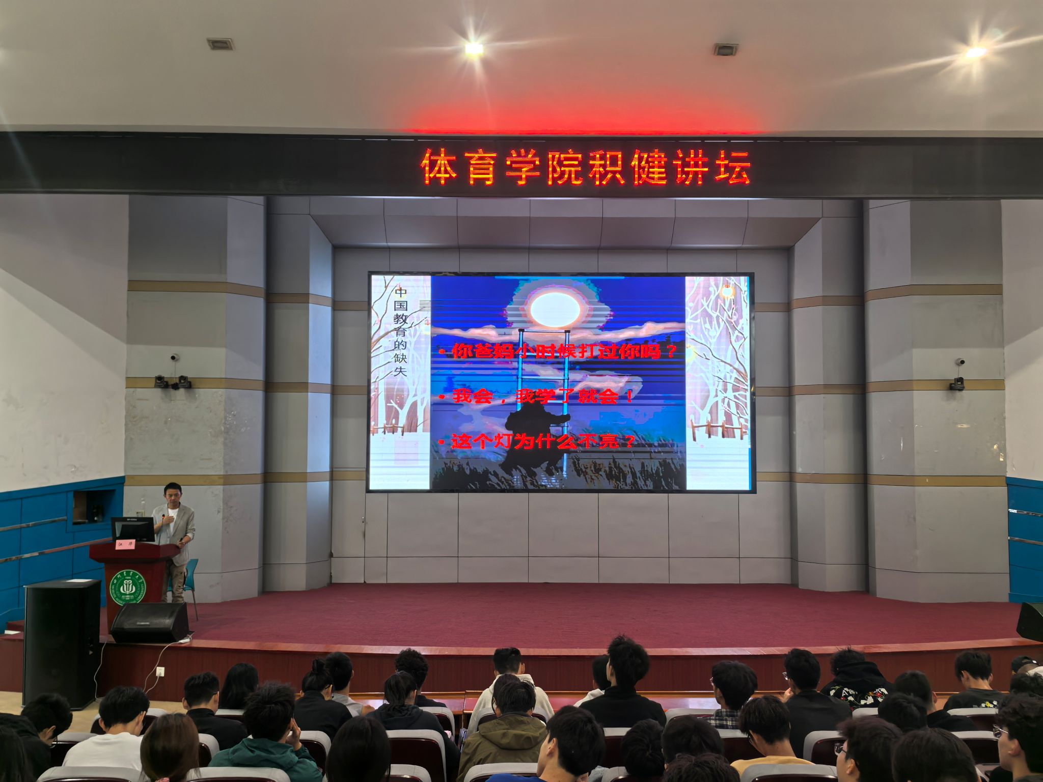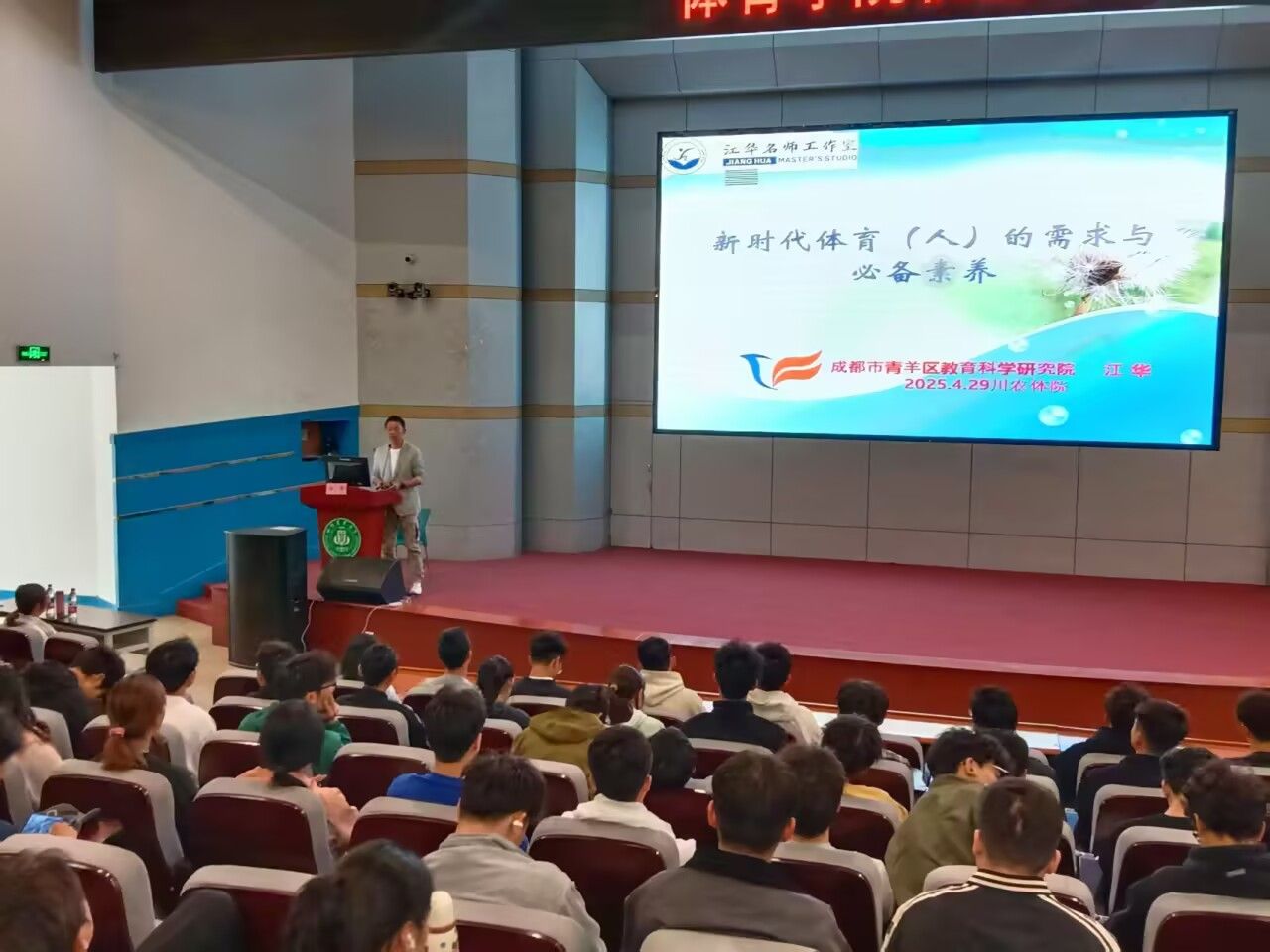 4月29日,万象城awc888积健讲坛在逸夫楼小礼堂迎来新的一讲,此次讲坛邀请到成都市青羊区教育科学研究院体育教研员江华担任主讲嘉宾,学院200余名师生聆听了讲座,学院党委副书记陈明滟主持。