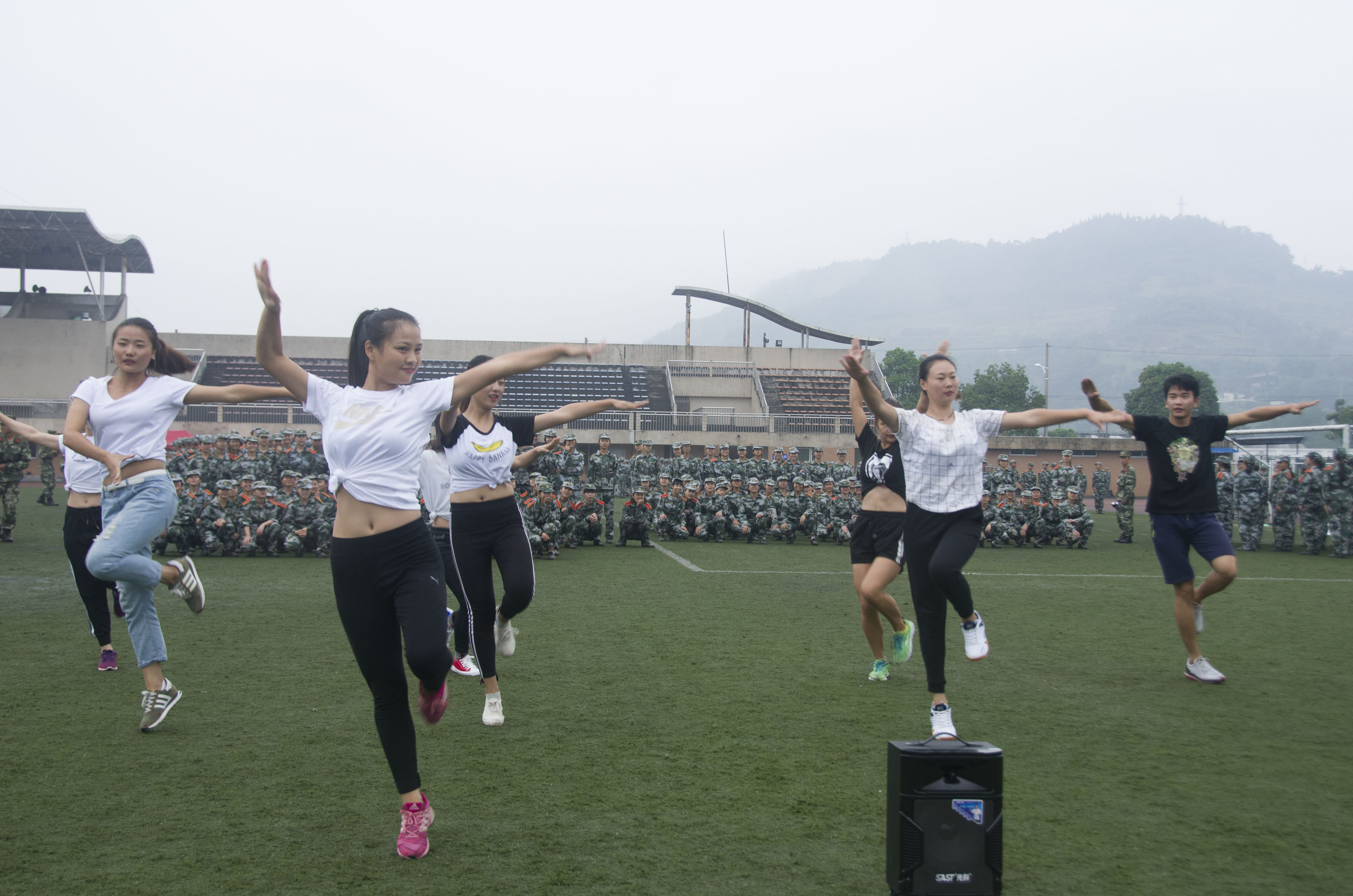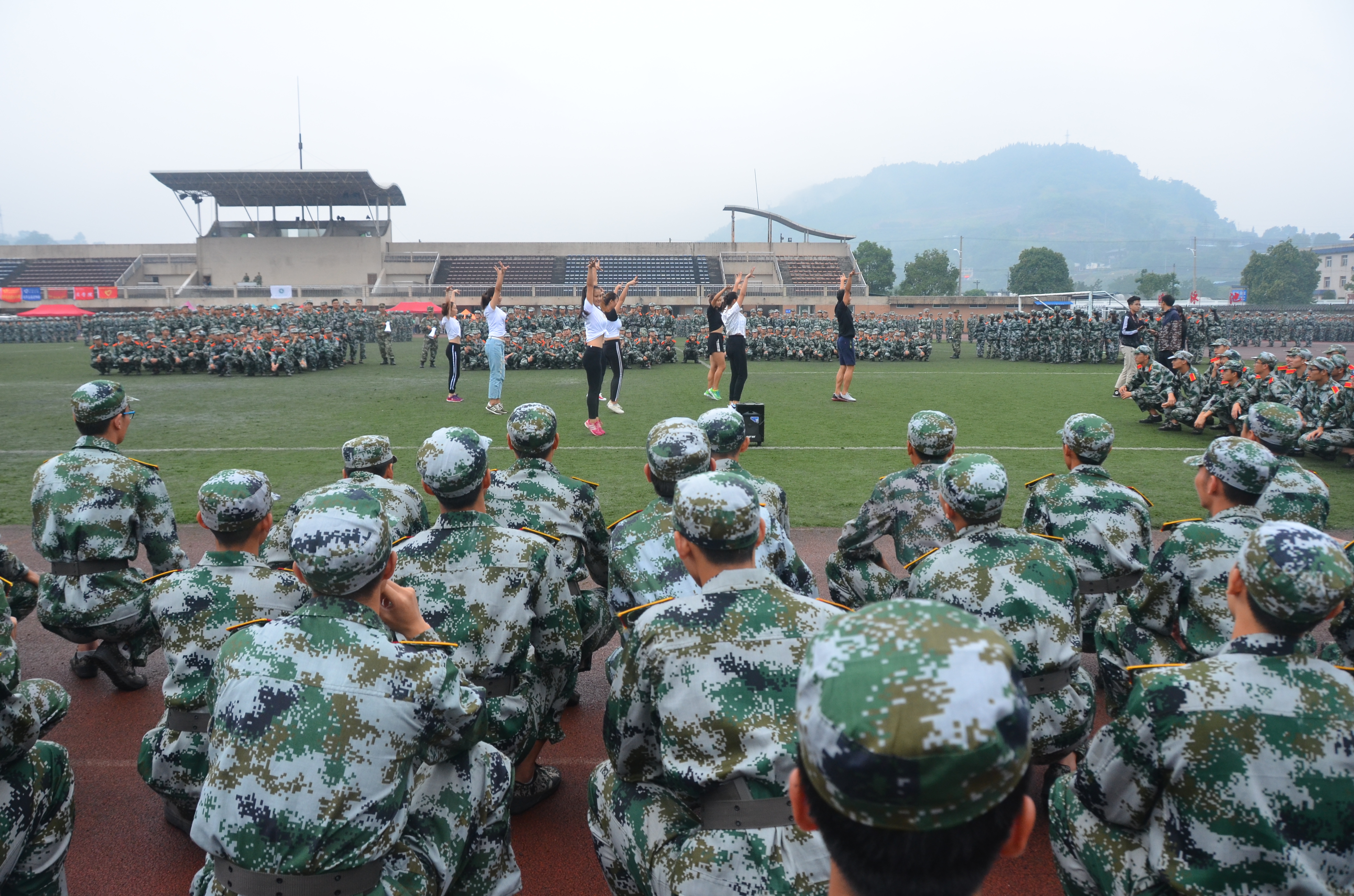 9月14日,雅安终于不再辜负“雨城”的盛名,淅淅沥沥的雨点轻轻拍打着同学们。万象城awc888院长邓跃宁,党委书记兼副院长王建强,副院长杨英,党委副书记蒋颖来到了军训场看望同学们。万象城awc888健美操代表队也踩着雨点来到了军训场地,为大家带来一场充满活力与激情的表演。