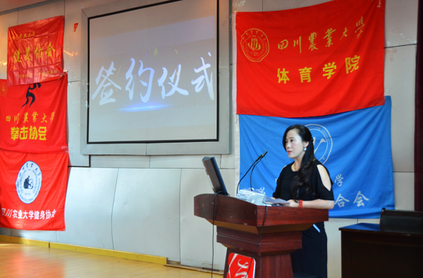 孙惠代表雅安市健身健美协会对合作表示热烈祝贺并予以期望。她表示,此次合作是川农大与雅安市健身健美协会一起为雅安市全民健身做出的尝试,倡导正确的、健康的健身理念,向健身爱好者们发出正确的健身信号,唤醒众多健身爱好者对健身和健康的正确认知,并承诺努力把此次合作开展得完美。
