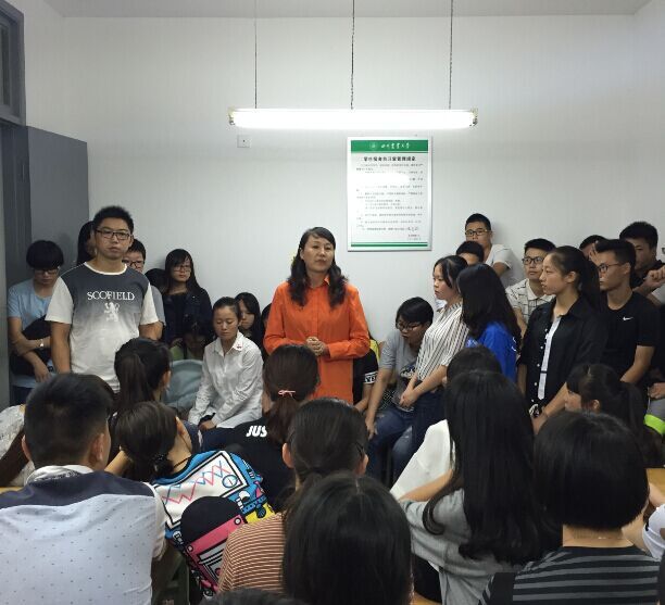 在寝室自习室举行的师生见面会上,杨英老师发表了热情洋溢的讲话,对2016级的新生们表示热烈的欢迎,向新生们简要介绍了体育系多彩的办学历史和概况,并向同学们介绍了社会体育专业和体育教育专业的诞生、发展及美好前景等,说到今年是自学校开办体育专业以来第一年按照文化上线、体育分数从高到低录取,老师们更是对16级新生们充满期待!