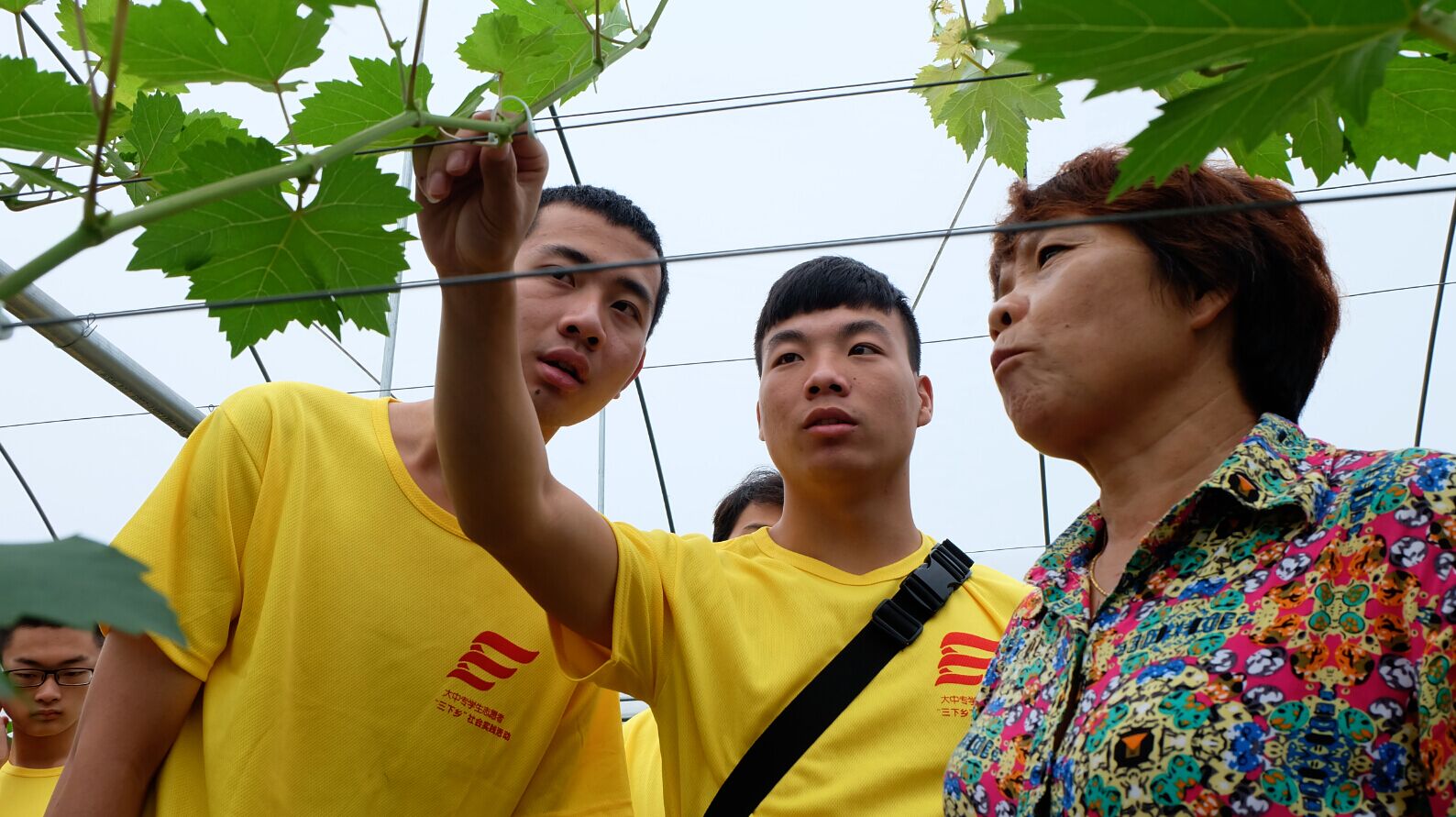 清晨,伴随着淅淅沥沥的小雨,100亩种植葡萄的“紫藤园”呈现在眼前。一进“紫藤园”,团队成员就被枝繁叶茂的葡萄藤蔓所吸引,整齐排列成一道道长廊。“把美人指放在长廊前,希望能够使其长藤蔓缠绕在铁丝上,能够更加美观。”精心修剪的美人指迎着风摆动,带着让人喜悦的繁盛。