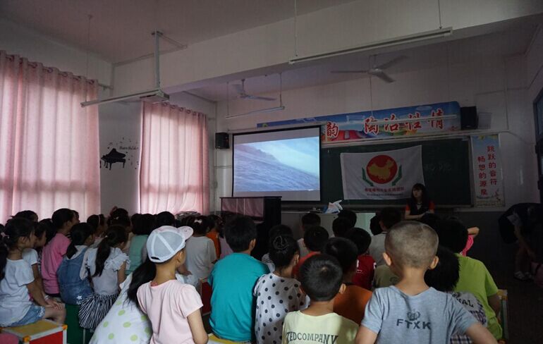 当天早上8点半,团队成员来到学校音乐教室,做好了播放电影的各项准备工作,备好了小零食和水等着学生们的到来,9点左右,学生陆续到来,签到后各自找到自己的位置安静的坐好等着电影开始。团队成员经过队内商量以及与学校老师商量选择了电影《恐龙》,电影开始播放后所有同学都目不转睛的盯着屏幕,仿佛自己是电影中的某一条恐龙,特别激动。当电影放到陨石坠毁,给地球给恐龙带来毁灭性的伤害的时候,队员还给学生们普及了恐龙灭绝的原因,呼吁同学们从身边小事做起保护环境,还向同学们提问日常生活中应该怎么做,学生都很积极的举手回答,不乱丢垃圾,随手关灯关水,不踩草地,不破坏植物等等,并且还有几个高年级的同学还提出了生活中可以变废为宝这一点,得到了大家的认可与支持。