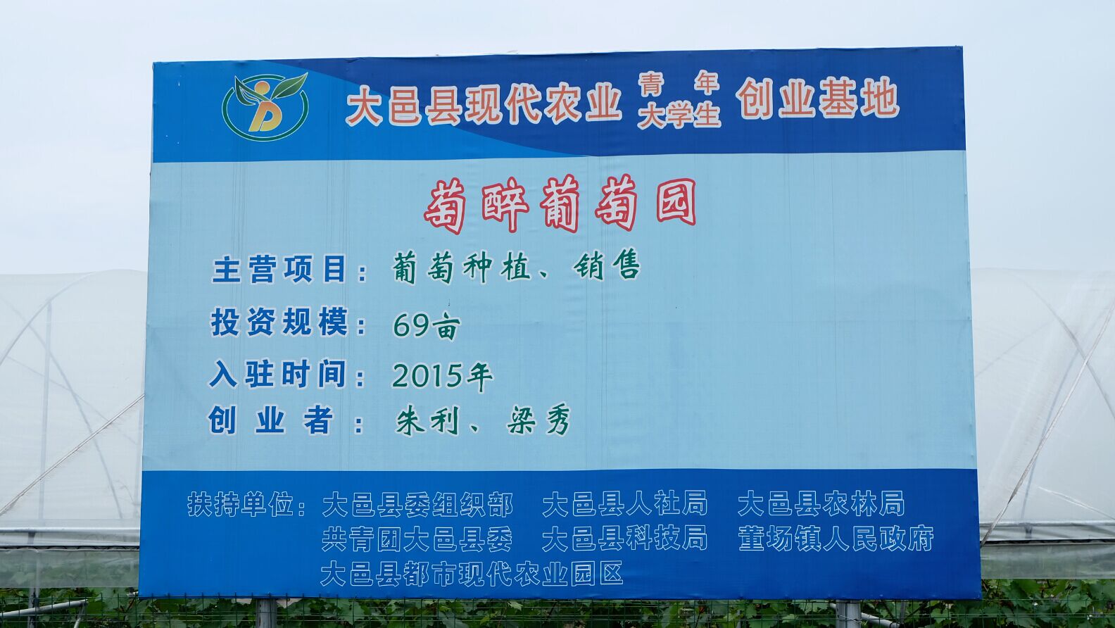 今晨,路途中下着小雨,沿途的乡村小道没有想象中的寂静,偶尔几声鸟鸣打破沉寂。由园区主要负责人黄川带队到今日活动目的地——萄醉葡萄园。“该葡萄园由主管朱利、梁秀于2015年正式开始经营,总占地69亩,逐渐走向规模化”。园区门口立着蓝色木牌,在清晨的雨滴中格外耀眼。