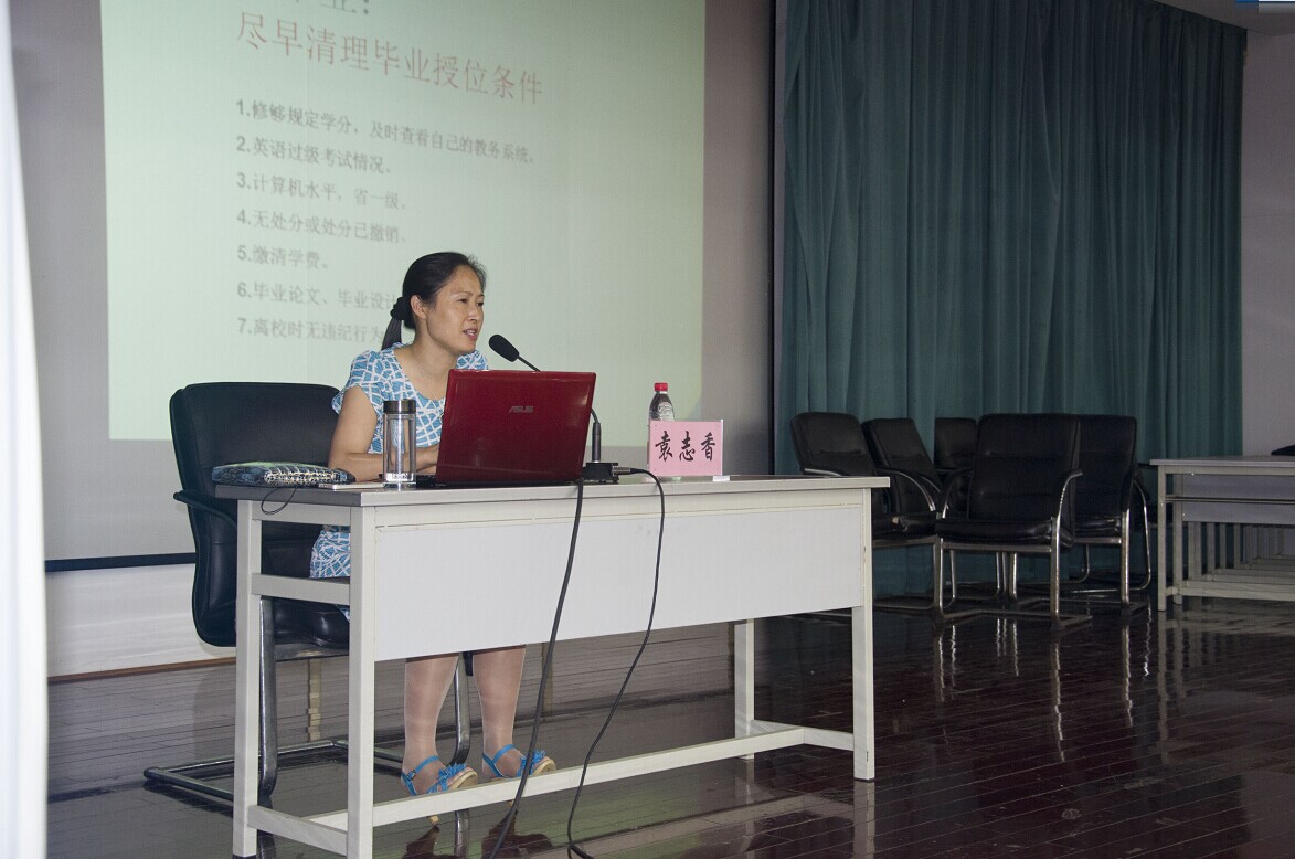 会上,袁书记做了动员讲话。她从当前的就业形势引入话题,针对毕业生“就业难”的问题,为学生们分析了出国留学、升学考研、参加国家基层项目以及自主创业的优、劣势,勉励大家要尽快目标明确、做好准备、把握好自己的就业方向。她从“毕业的七个条件、如何树立正确的就业观、自荐书准备的注意事项、求职日程安排”等方面做了详细的解读;并勉励同学们树立“以创新带动创业,以创业促进就业”的理念,结合专业特点和自身优势积极创新创业;当她讲到 “考研、考公务员、应征入伍、一村一大、西部计划”等就业去向时,她更是反复叮嘱每一位同学不要放弃任何一次机会。