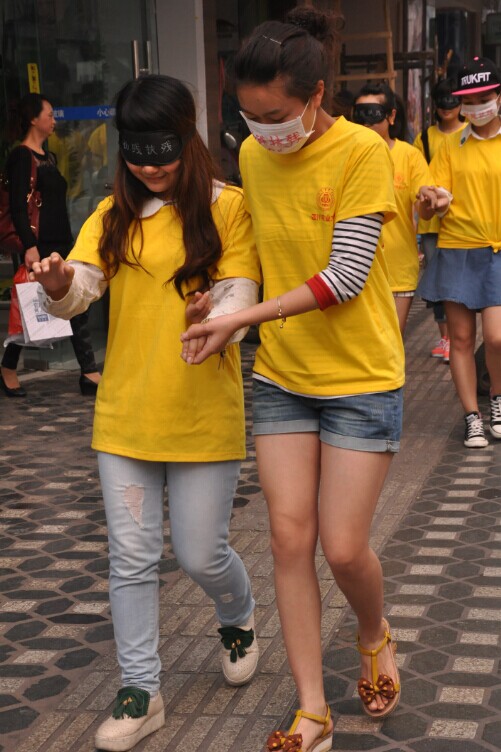 2014年5月8日下午4点学院学生权益部携手青年志愿者协会与学生传媒中心在雅安吉选超市门口进行 “蒙上眼睛, 我们一起走盲道”的主题教育活动。