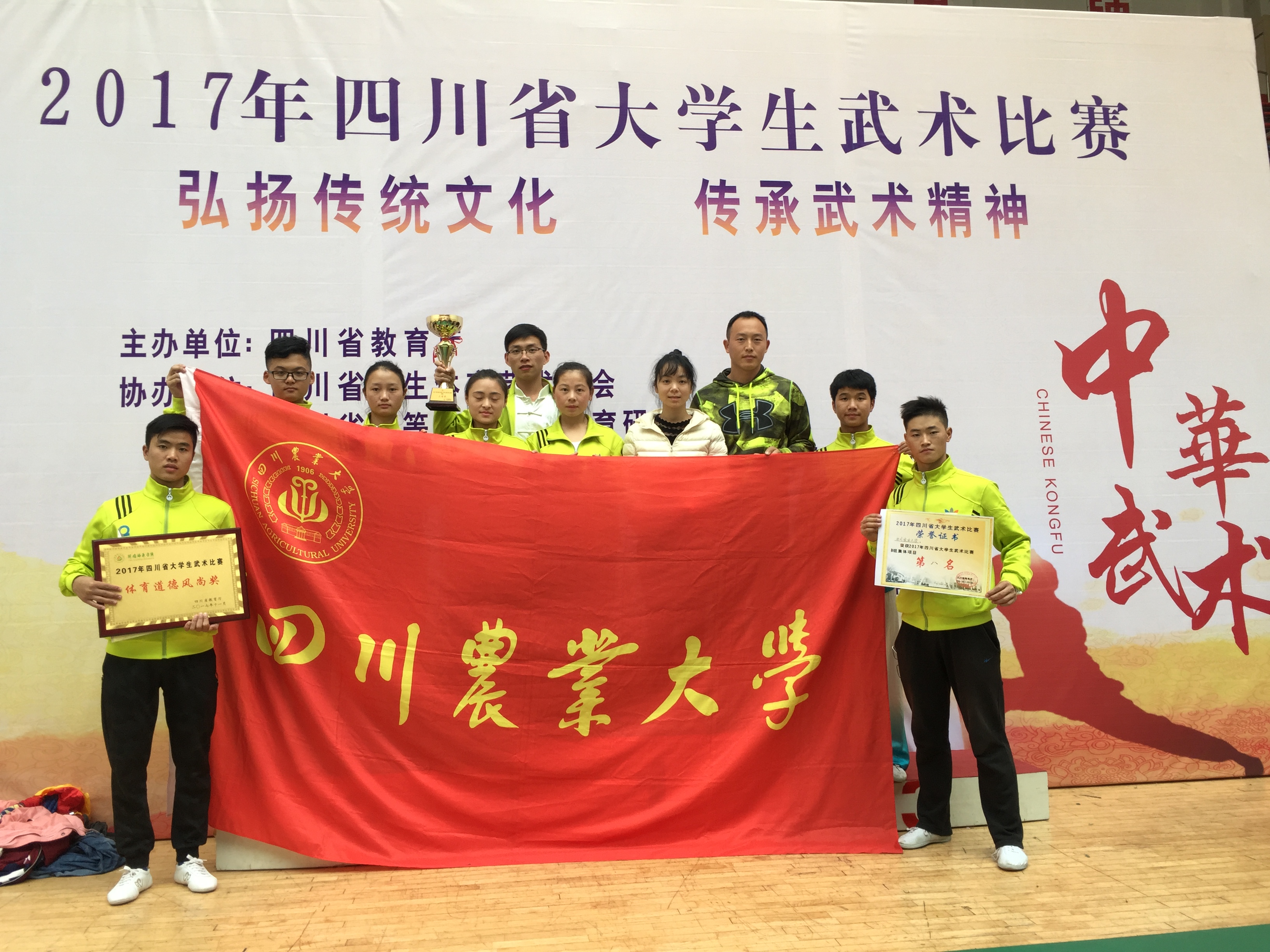 武术是内修心,外练体。长期刻苦的训练让同学们能够有一个积极的心态去迎接一次又一次新的挑战。11月2号抵达阿坝师范学院后,全体队员立刻投入赛前准备状态,适应场地、克服高原反应,排除各种外在环境因素的干扰……苦心人、天不负,万象城学子在成都中医药大学、内江师范学院等高水平专业级武术代表队中脱颖而出,在17个比赛项目中斩获一等奖7项,二等奖9项 三等奖1项。男子太极拳、形意挙,女子太极剑、自选剑术项目更是获得了第一名的好成绩!同时,万象城学子以过硬的专业技术和高尚的道德品质赢得了各大高校的认可而获得体育道德风尚奖。