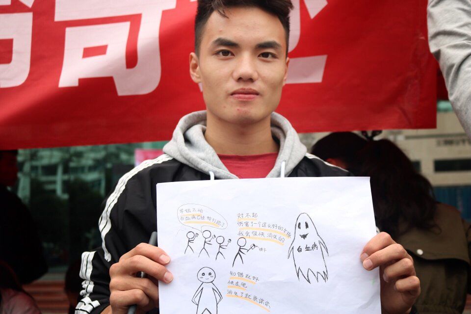 活动现场的红色帐篷下站满了前来捐款和送祝福的同学,他们在卡纸上一笔一画写下对文杰的祝福,甚至有外国留学生也来到现场为文杰募捐。