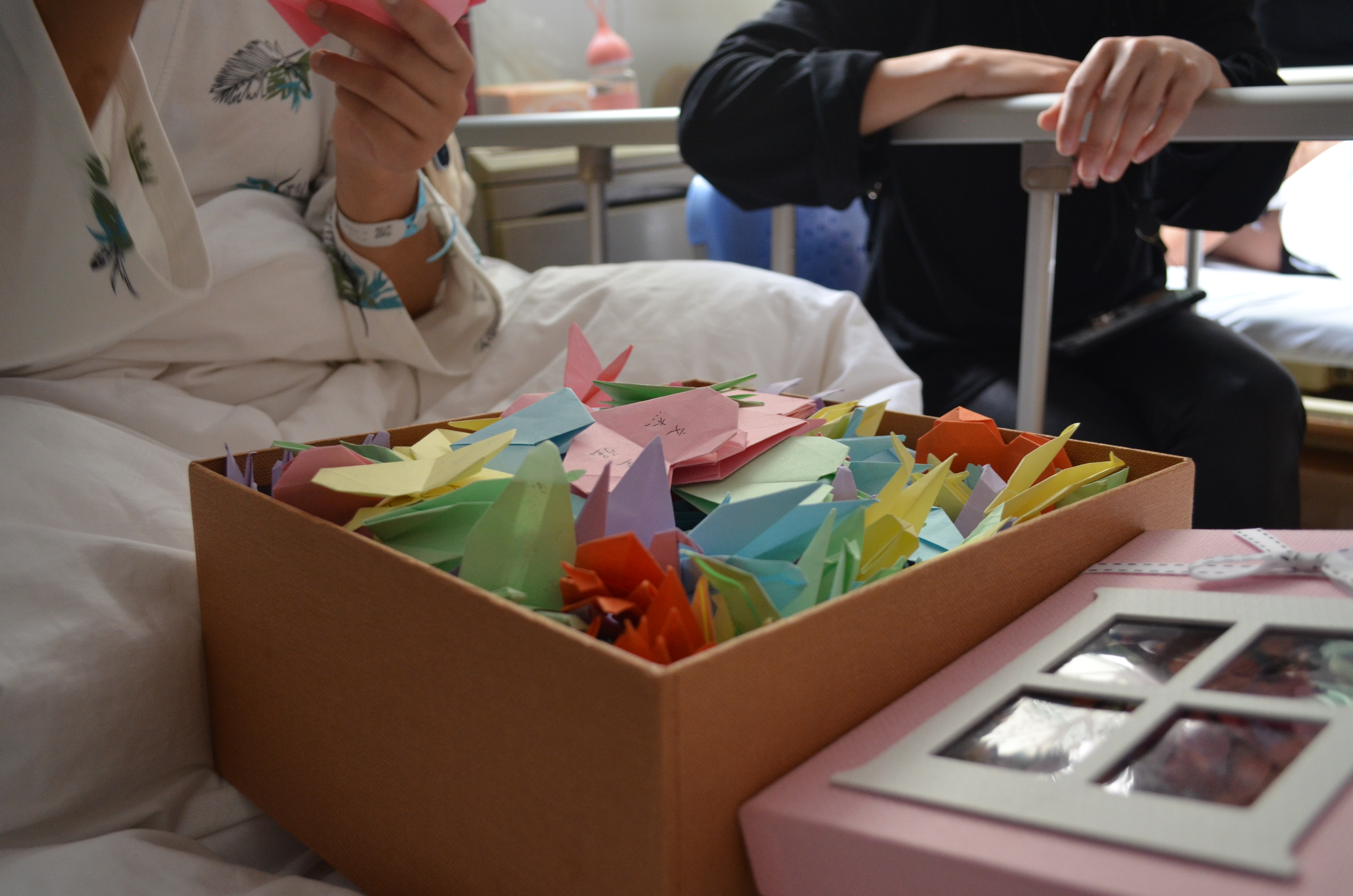 蒋颖等人为谭文杰带去了千纸鹤的祝福和爱心款,向家长和孩子详细了解病情,鼓励孩子坚强、勇敢与病魔做斗争。刚刚结束了化疗的谭文杰笑着说:“我现在状态真的挺好的,感谢老师和同学们的关心,我一定会尽快好起来,回到学校!” 她的乐观、懂事让在场的每一位都深受感动。