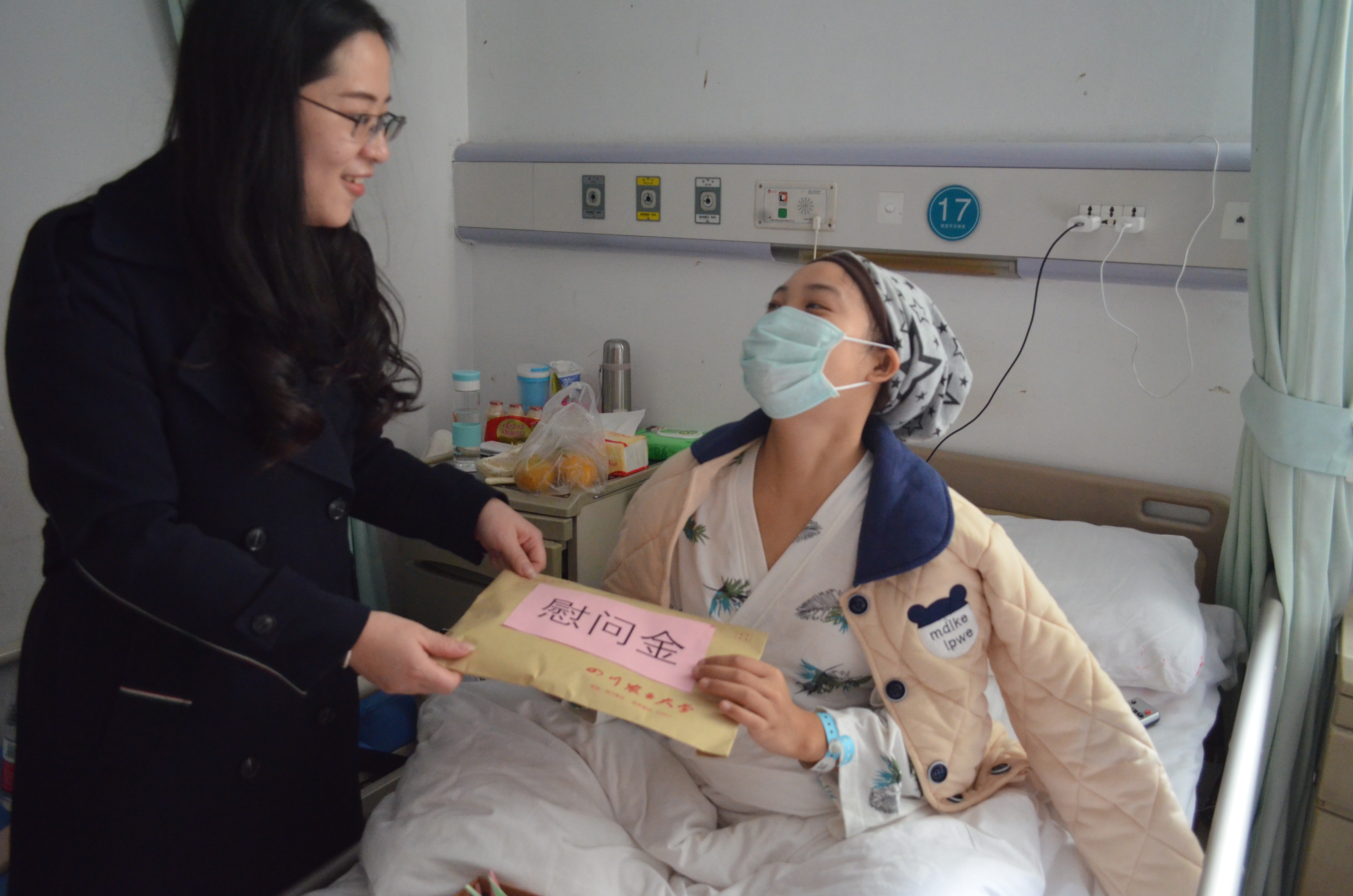 11月2日,万象城awc888党委副书记蒋颖、体育201601班班主任杨小兵等师生四人前往重庆第三军医大第一附属医院看望生病的谭文杰同学。