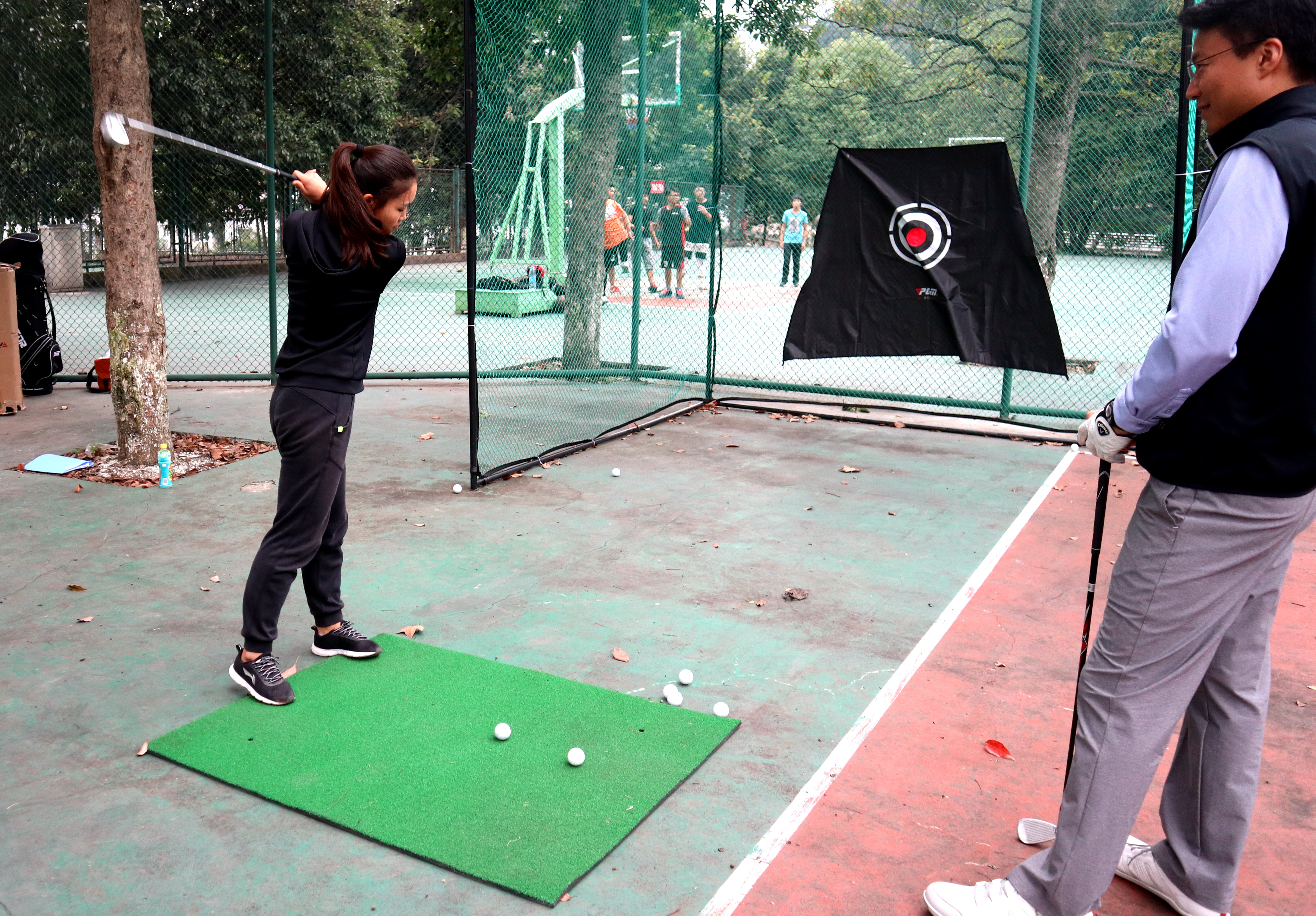 先从挥杆动作的回忆,上节课表现最好的同学进行示范,再到李秉灿示范教学,同学们个个摩拳擦掌,跃跃欲试。“每个人击球五次”一声令下, 三个打击笼,一块草坪,高尔夫球、每人一根球杆,高尔夫正式开始了!“knee,knee,knee”一位同学用简单的英语单词配合着自己的身体向老师发出了疑问。李秉灿则膝盖微微弯曲,指着自己的腿表示这样的站姿是正确的。“有些同学英语比较好,有些要差一点,在交流的时候可能会有影响。但是,没关系,我可以用身体语言来交流。”李秉灿风趣地说到。虽然上课同学较多,语言也比较吃力,但是他仍然会尽量指导每一个同学。