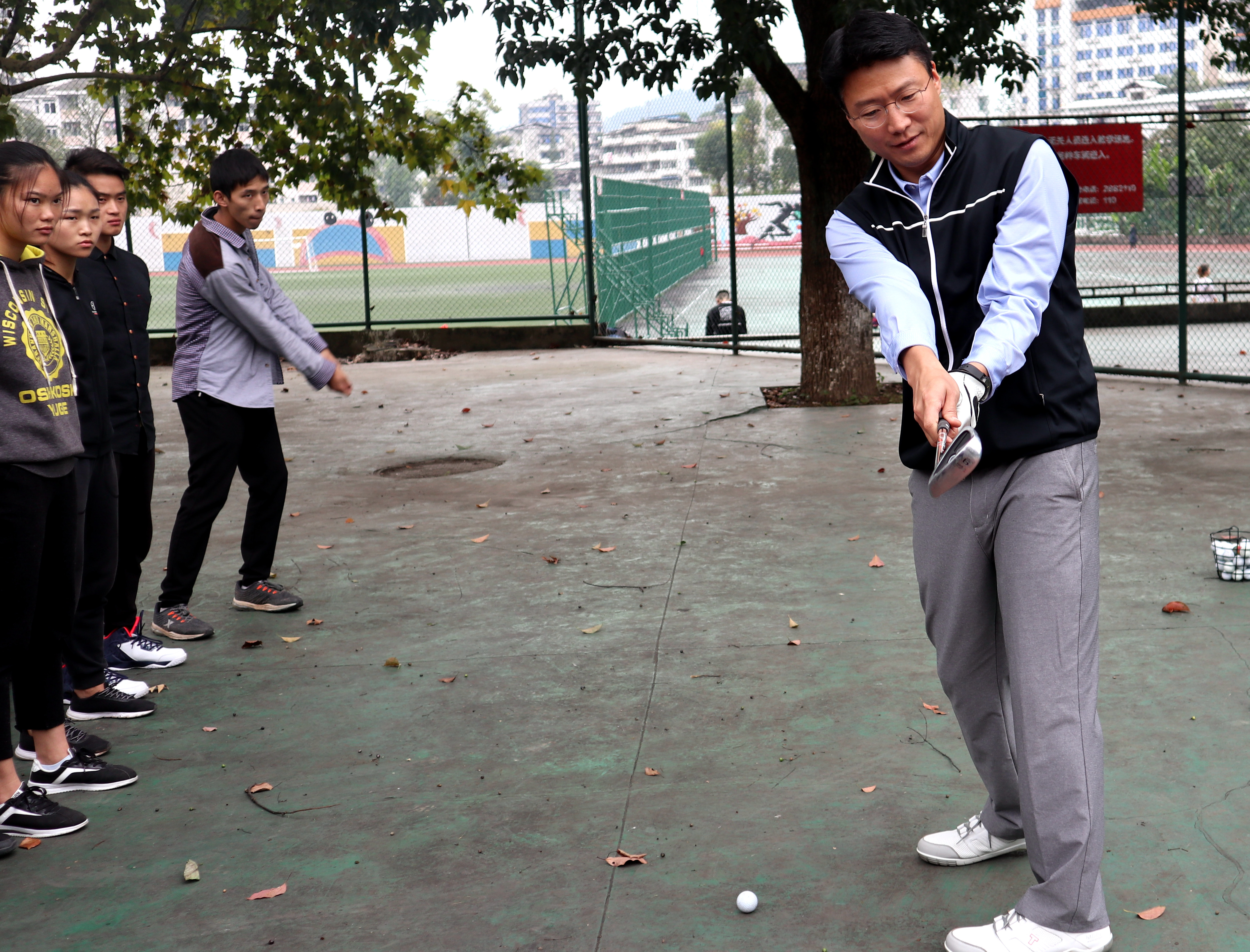 找准位置,左手三指先将球杆抬起,食指和拇指再轻轻握住,右手小指缓缓嵌入左手食指与中指间,双手部分重迭。握杆的双手指节分明而有力,整个动作好像一副优雅的画卷。“同学们,经过周末,高尔夫基本的挥杆动作还记得吗?”万象城awc888袁晓辉老师向大家问到。只见袁晓辉身旁还站了一名教师,他们两人不时用韩语交流着,原来那是刚到万象城不久的韩国籍教师李秉灿博士。李秉灿博士毕业于韩国高丽大学体育学专业,同时也是高尔夫指导师、剑道指导师、滑雪指导师。这次他能到万象城执教正是基于今年5月万象城awc888和韩国龙仁大学正式签订的国际交流合作项目。