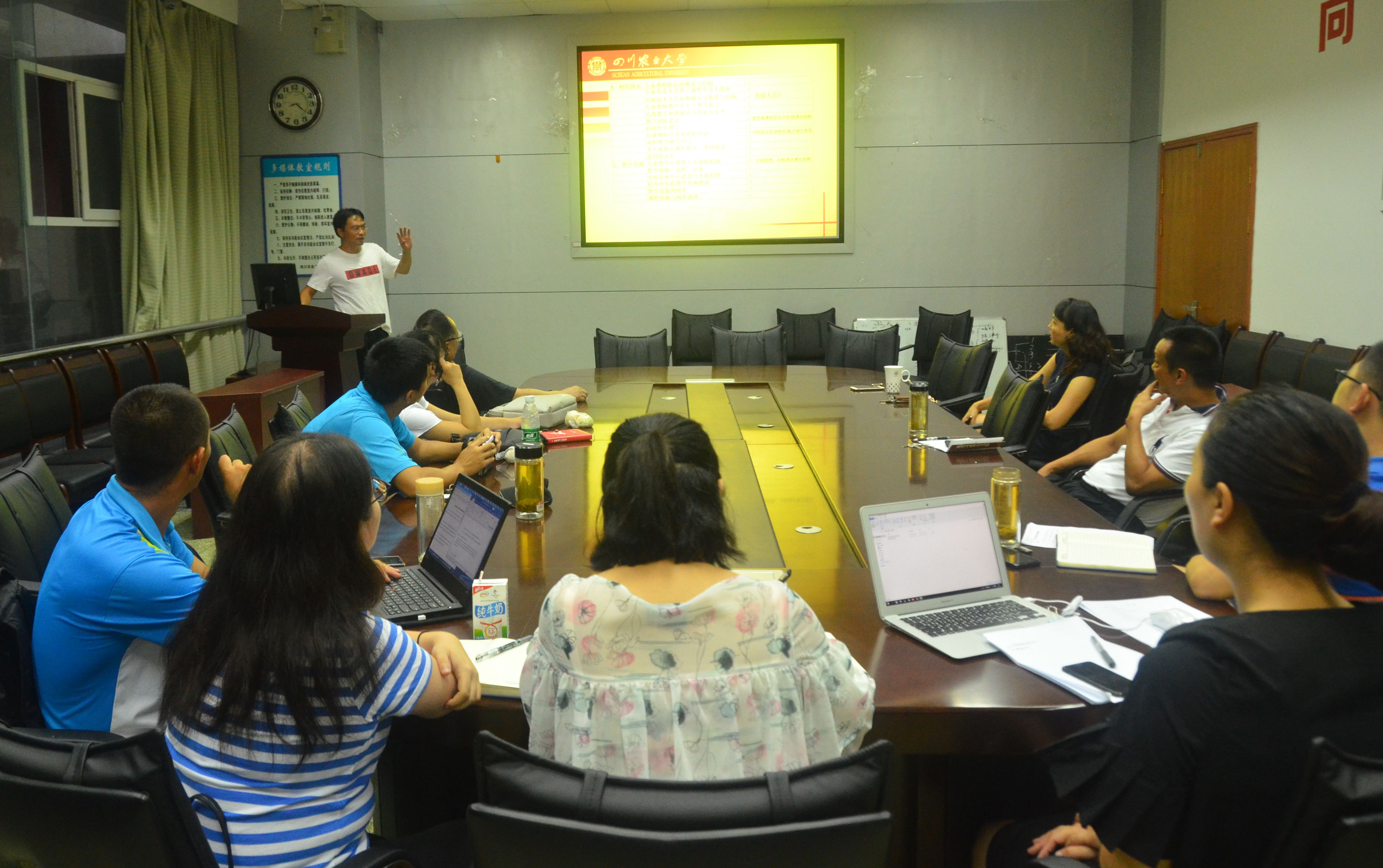 会上,王建强首先对各位老师在暑期的工作成果进行了肯定,并说明了召开此次工作报告论证会的目的。他强调,学院工作报告在本科教学审核评估中占重要角色,它是学院教学工作改进的重要参照物,各老师应以动态发展眼光不断完善工作报告中出现的问题,做到实时更新,处处跟进。接着,体育教育专业、休闲体育专业、社会体育指导与管理专业各专业负责人分别从专业定位、办学特色、师资配比、现阶段存在的主要问题等方面进行了详细说明。学院评建办公室李琳琳老师从学院基本情况、加强本科人才培养工作的做法和取得的成绩等方面对学院工作报告进行了陈述。