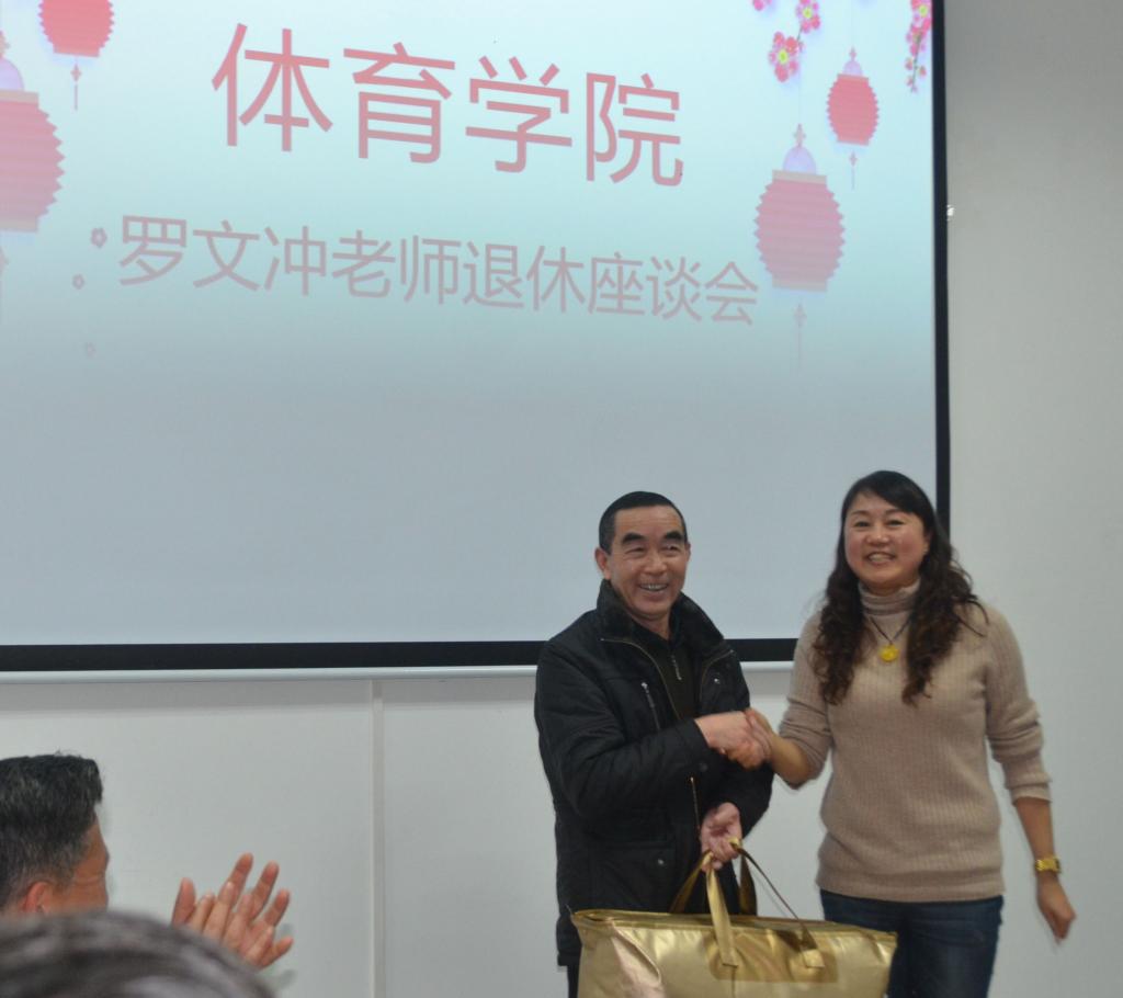 王建强、杨英代表学院向罗文冲老师颁发了退休证,送上慰问金和纪念品,并合影留念。