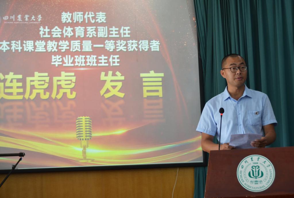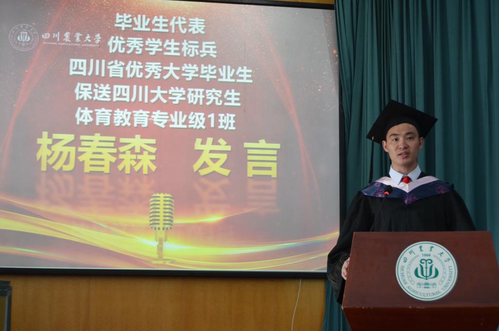 学院学生代表,来自2015级体育教育1班杨春森同学深情回忆与川农体院有关的青春与过往,誓言不断发扬川农大精神和“尚文勤练,积健图强”的学院精神,崇尚文化,博学修身;勤奋学习,刻苦训练,做一个有内涵、有品位、有文化的体育人,为实现体育强国而不懈奋斗!