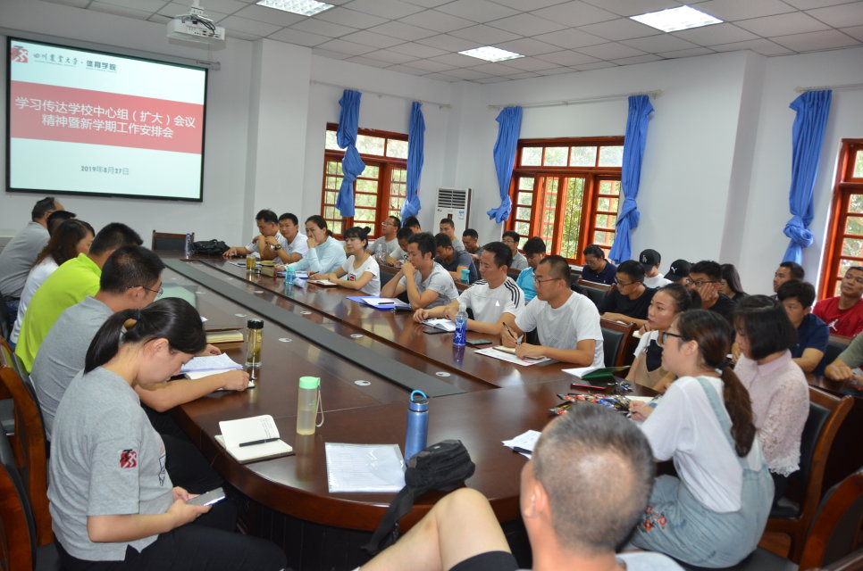 首先,王建强传达了学校党委中心组(扩大)暨中层领导干部会议精神,带头学习了习近平总书记近期重要讲话精神,进行了“不忘初心、牢记使命”的主题教育。安排部署了2019年下半年学院重点工作。他指出,下半年要进一步优化干部队伍结构,加强本科专业建设,继续巩固风清气正的良好政治生态,切实落实本科人才培养的根本任务。随后刘骞对本学期的教学工作进行了总体安排和部署,要求全院教职工以《四川农大体育教师上课“九必须,八不准”规定》和《万象城awc888教师课堂行为规范》要求自己,做好教书育人工作。何勇对今年的招生就业情况进行了详细的分析解读,并传达了校领导对学院招生宣传工作的肯定以及取得的可喜的招生效果,同时他强调要继续加强学风建设,并要求党员教师用好“学习强国”平台,切实提升政治素养。