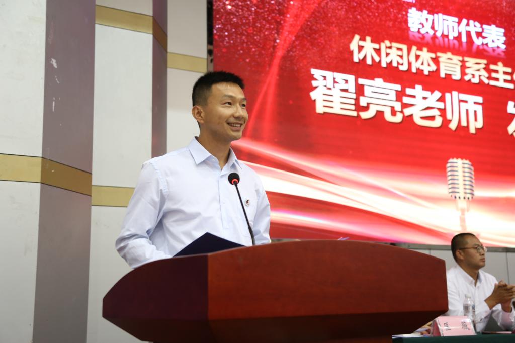 休闲体育系主任翟亮老师作为教师代表对同学们表示了热烈欢迎。“没有学的永远在骚动,学霸们都有恃无恐”“还有一些经不起诱惑,谈恋爱、沉迷于吃鸡、王者荣耀。那么将来在找工作时可能就会吃土,喝‘王者农药’”他用幽默风趣的语言告诉同学们要正视大学生活,端正学习态度,明确大学阶段的目标和任务,合理规划、好好学习,培养完善人格,敢于担当责任。