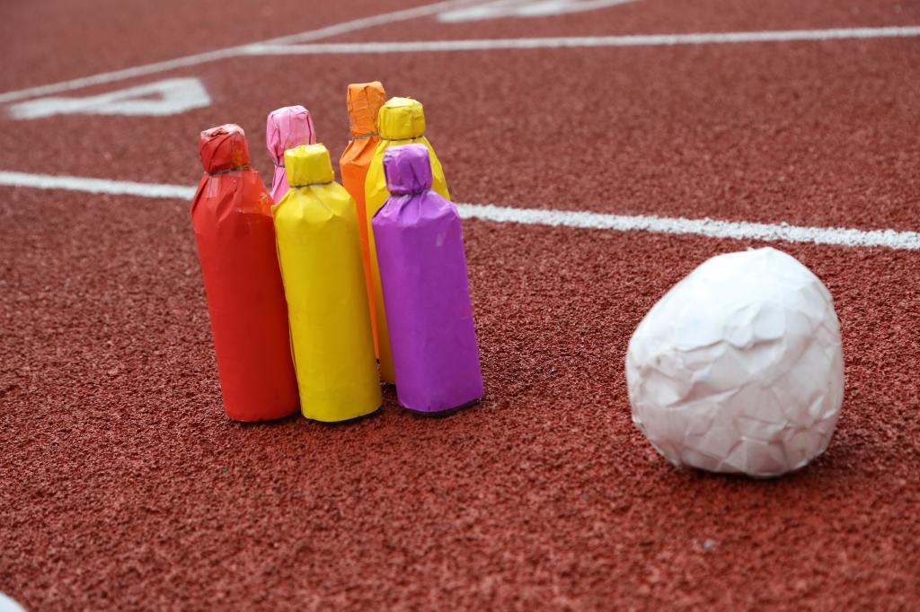 只因与寝室矿泉水瓶确认了眼神,与艺传院的废彩纸打了个照面,七彩的保龄球便横空出世。出品者李开艳等同学表示:“就寝室矿泉水瓶较多,突发奇想。七彩保龄球对小孩子有很强的吸引力,不仅锻炼心肺功能,而且提高小孩子的协调能力。最重要的是不受场地的限制。”
