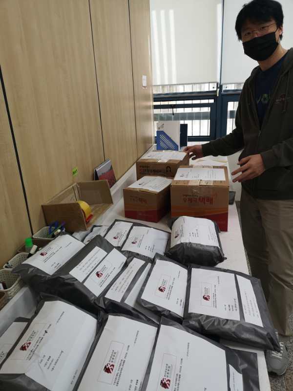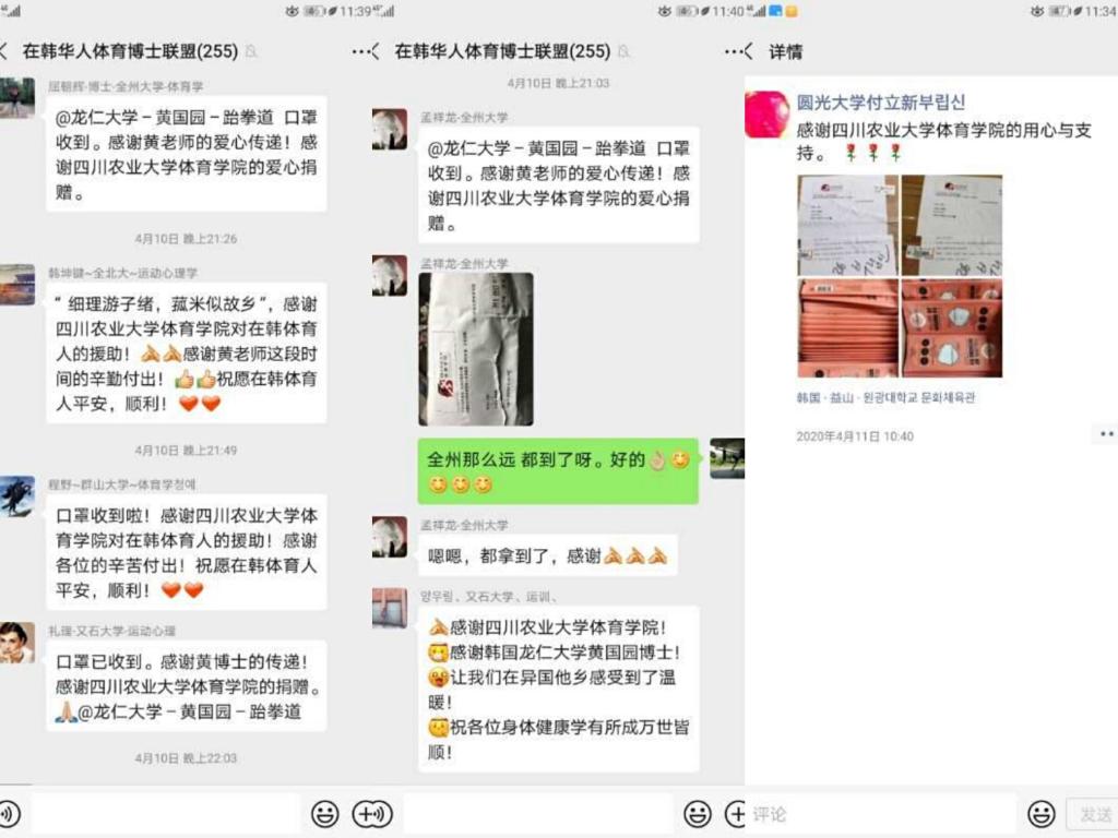 4月,我国疫情已得到有效控制,韩国疫情形势却日益严峻,万象城awc888院长王建强提出了转赠剩余的1200个口罩的建议。李秉灿与黄国园以万象城万象城awc888的名义面向在韩读体育博士的中国留学生,通过网络发起口罩捐赠活动,共收到来自18所大学(研究所)的65名体育学博士研究生的需求申请。从开始报名征集到完成口罩投递,李秉灿和黄国园仅用了一周时间。“万象城awc888”一时间成为赴韩体育博士留学圈的热点词。