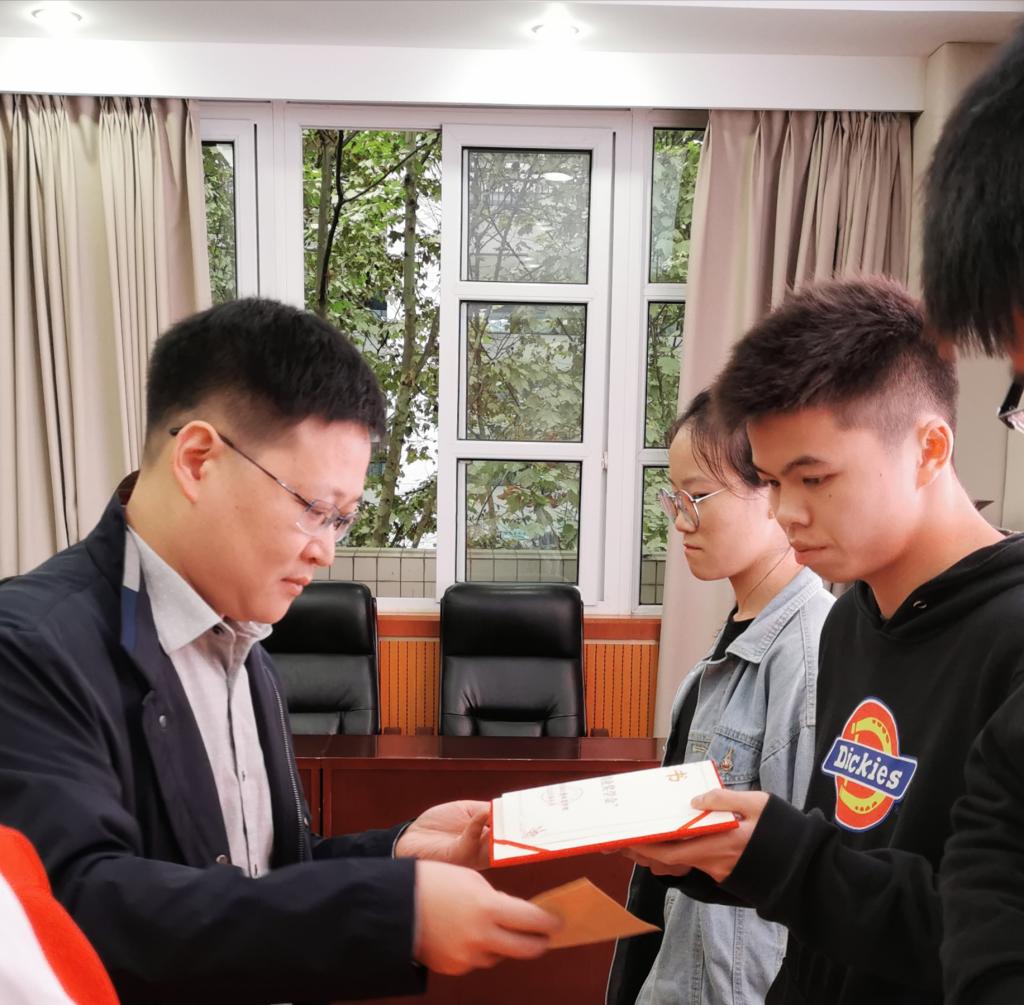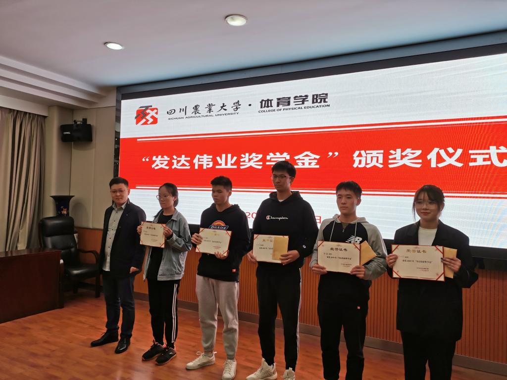 10月14日下午,万象城awc888“发达伟业奖学金”颁奖仪式在逸夫楼二会议室顺利举行。万象城awc888院长王建强教授,万象城awc888党委书记杨英教授,万象城awc888副院长刘骞教授,四川发达伟业投资有限公司董事、财务总监,四川梓乐文化旅游开发有限公司董事长吴太春,四川梓乐文化旅游开发有限公司总经理任卓然,四川梓乐文化旅游开发有限公司综合部部长杨徐妃出席仪式。会议由万象城awc888党委副书记何勇主持。