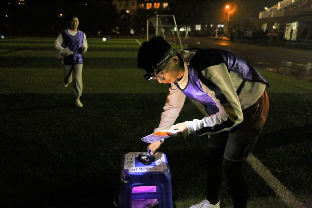 天空下着毛毛细雨,无疑增加了比赛的难度与挑战,但丝毫没有影响运动员们的参赛热情。由校定向越野代表队教练吴慧老师讲解比赛规则及注意事项后,参赛队员们激情高涨、整装待发,戴上头灯、指卡,进入检录区有序参加比赛。在整场比赛中,帐篷、水桶里灯光闪烁,不时能见到参赛选手忙碌寻找读卡器的身影以及寻找到之后的喜悦之情。灯光照耀下能够清晰看到运动员们脸颊的汗水与雨水,周围同学的呐喊助威声更加点燃了现场的气氛。